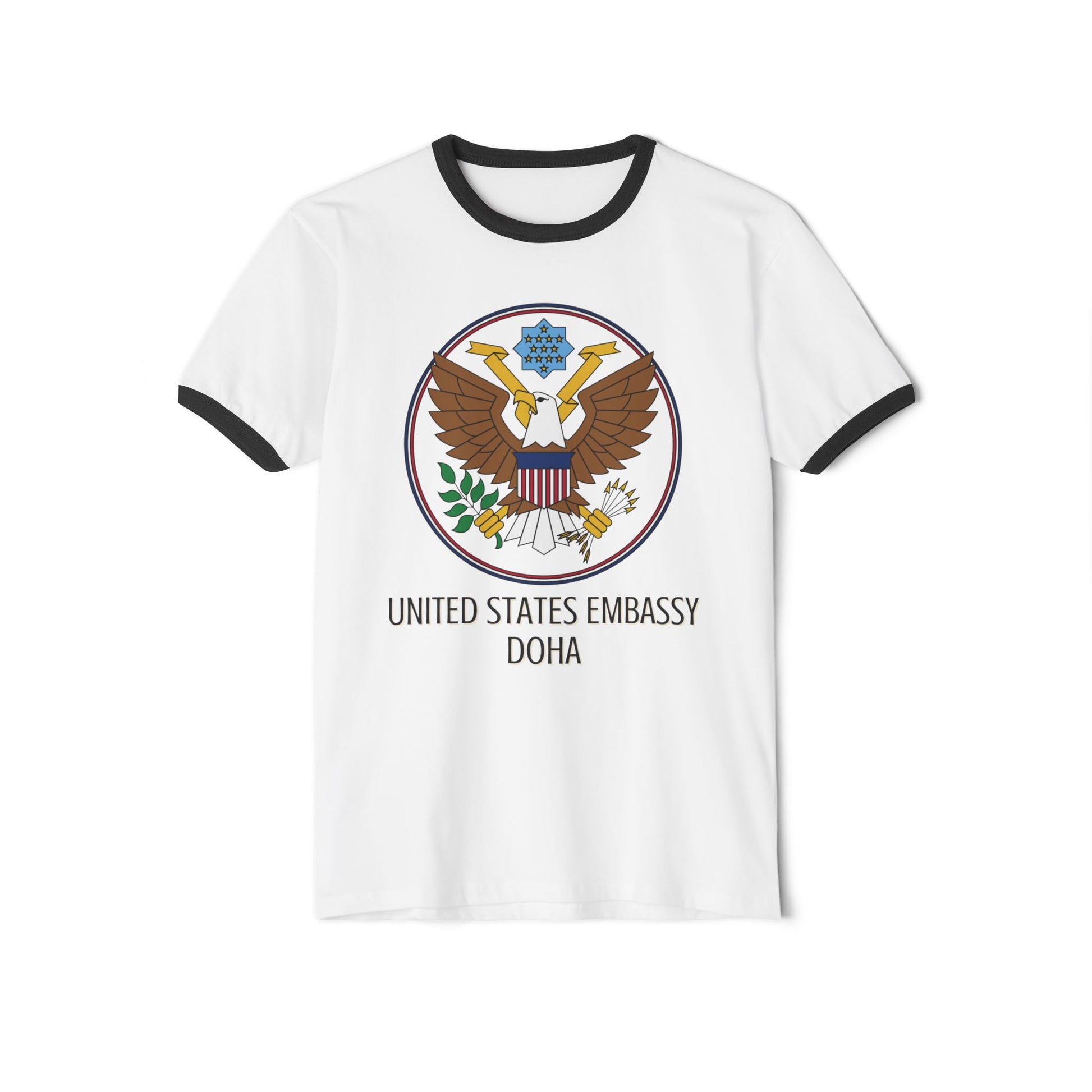 These custom ringer t-shirts are an all-time classic that offer clean style and a whole lotta attitude in one timeless package. Handsomely decorated with our own Art Deco take on the US Great Seal, these t-shirts exude post pride.