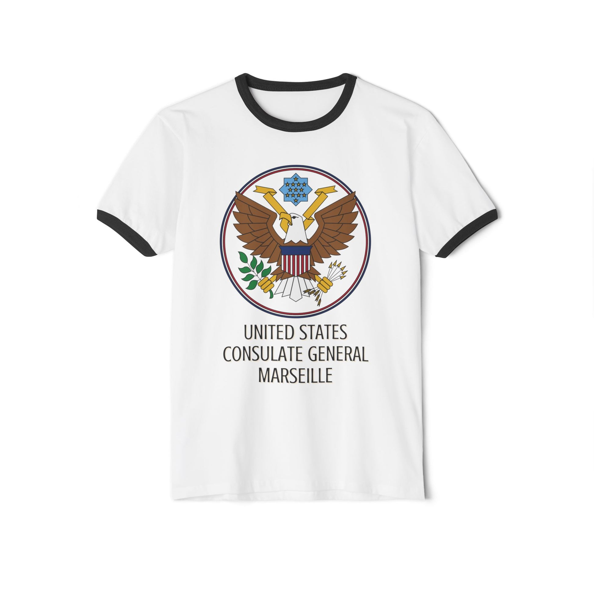 These custom ringer t-shirts are an all-time classic that offer clean style and a whole lotta attitude in one timeless package. Handsomely decorated with our own Art Deco take on the US Great Seal, these t-shirts exude post pride.