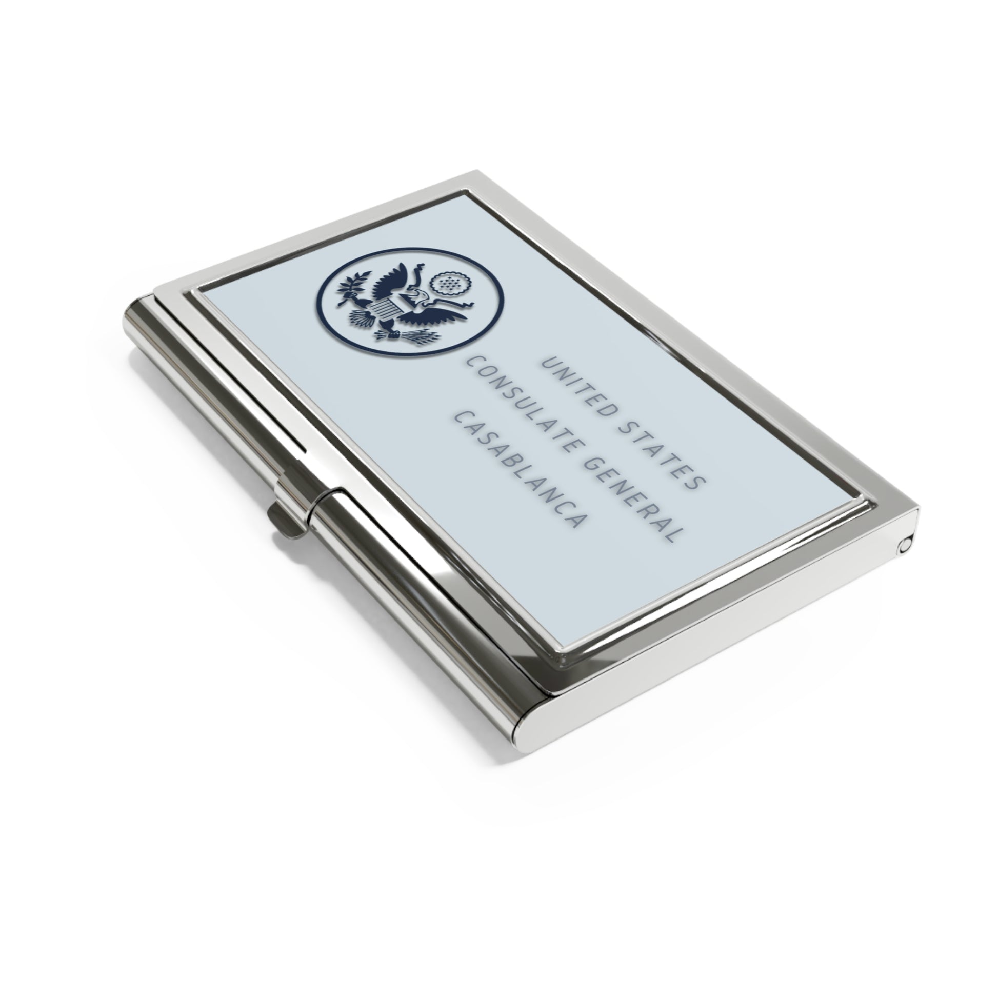 Don't yank business cards out of your pocket like a first year graduate student. Bring the class and the gravitas that comes with a handsome, metal business card holder, printed with your post name and a modern iteration of the Great Seal on the cover.