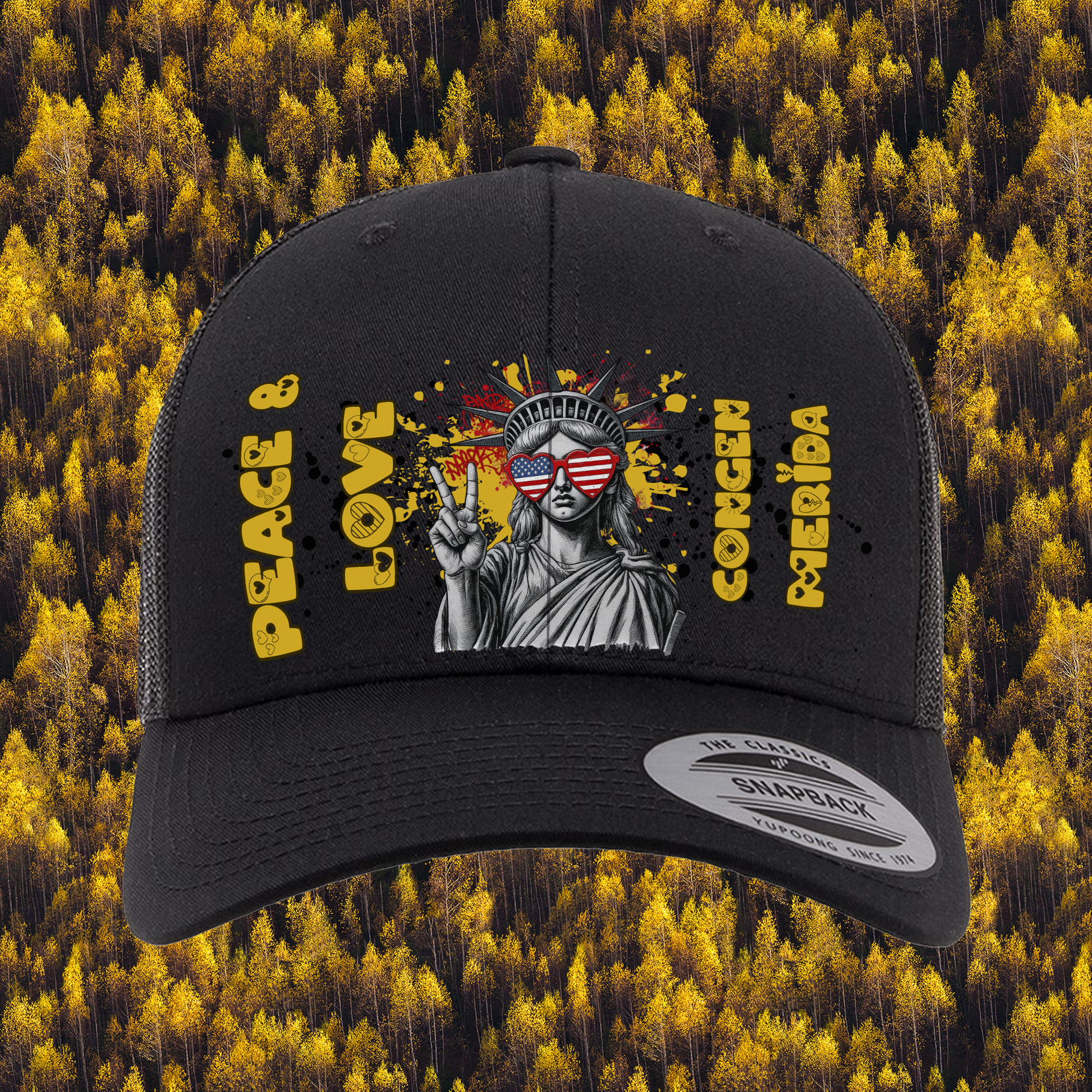 Looking to rep some post vibes with a dash of American spirit? We've got just the thing: our exclusive "Peace & Love" trucker hats! Picture the iconic Statue of Liberty rocking star-spangled shades, flashing a peace sign, and surrounded by graffiti-style splashes—it's fun, funky, and totally you.