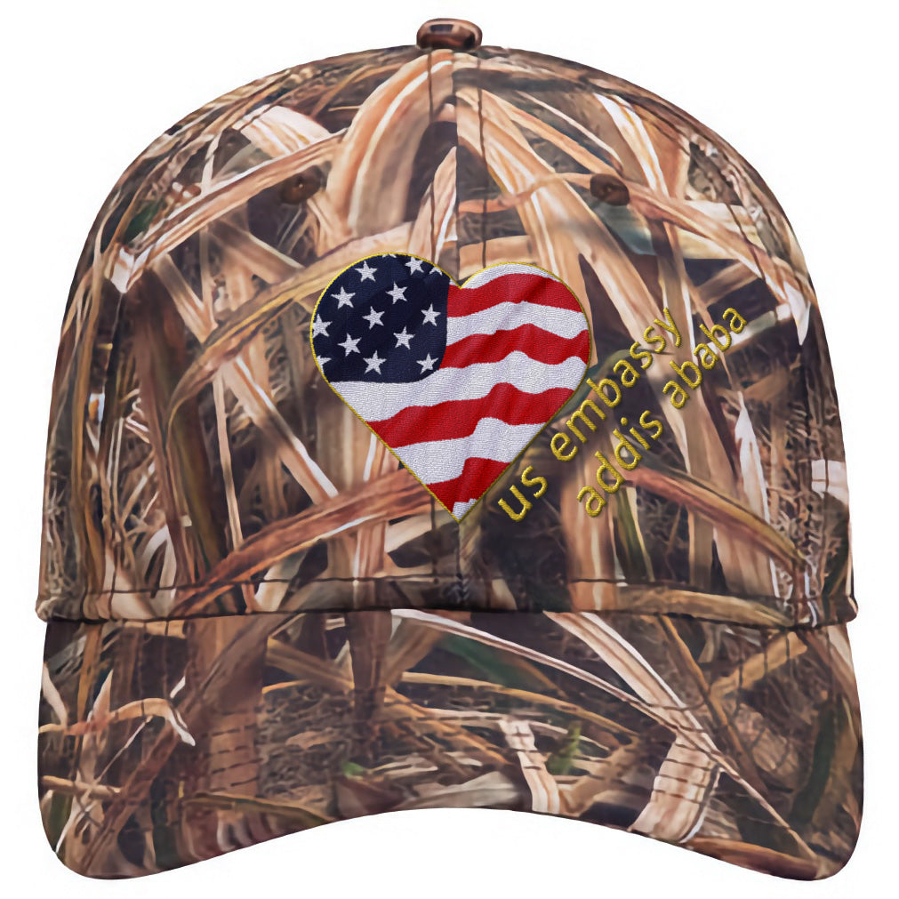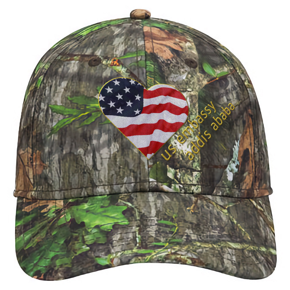 Top quality, structured, camouflaged 6 Panel hat is offered in six printed designs. These printed designs are Mossy Oak® favorites which help you keep your head out of sight in a variety of environments. The only thing that won't melt into the background is the striking and fun ♥ logo featuring a centered US Flag heart and an off-center post name. Wear this proudly anywhere you want to be seen and not seen at the same time!