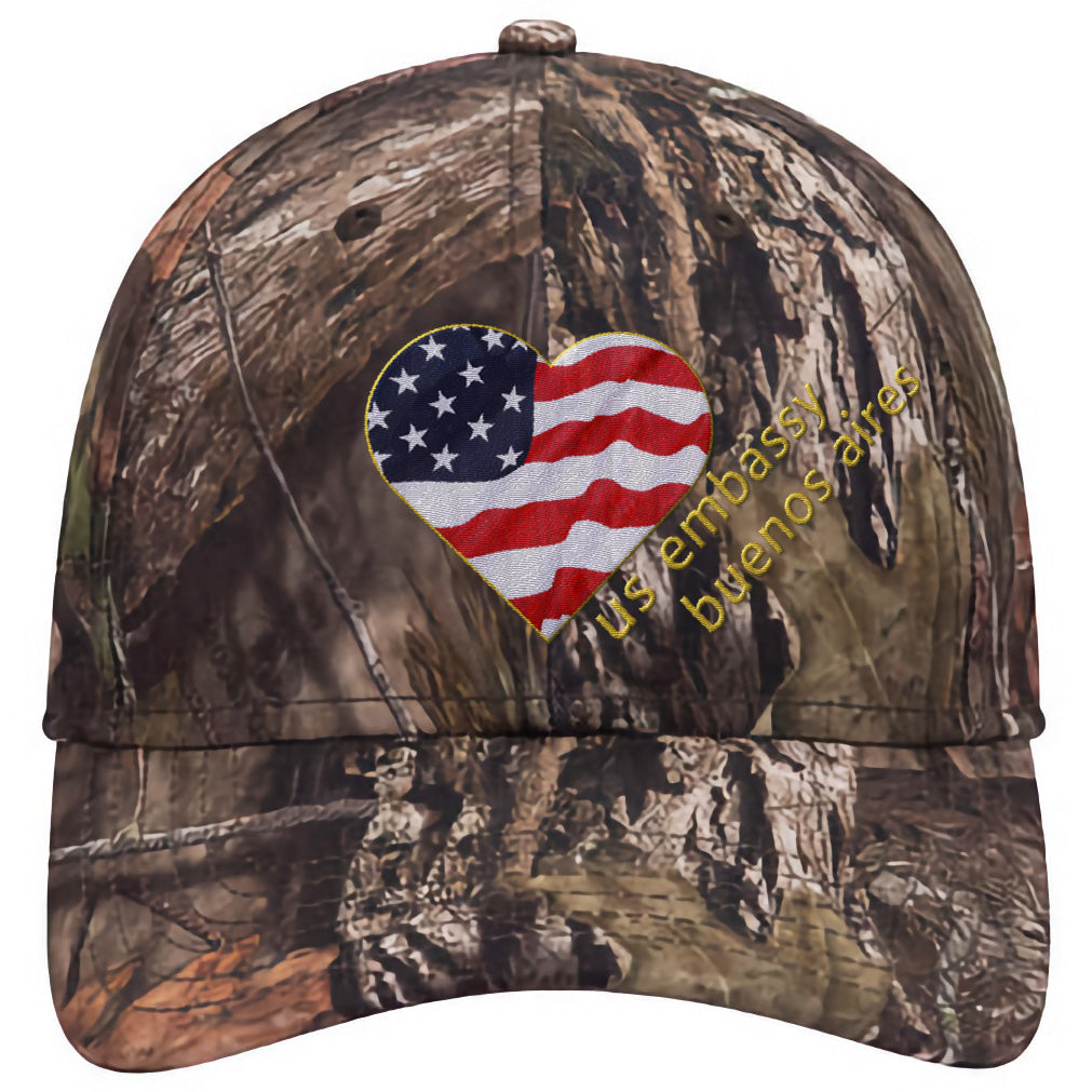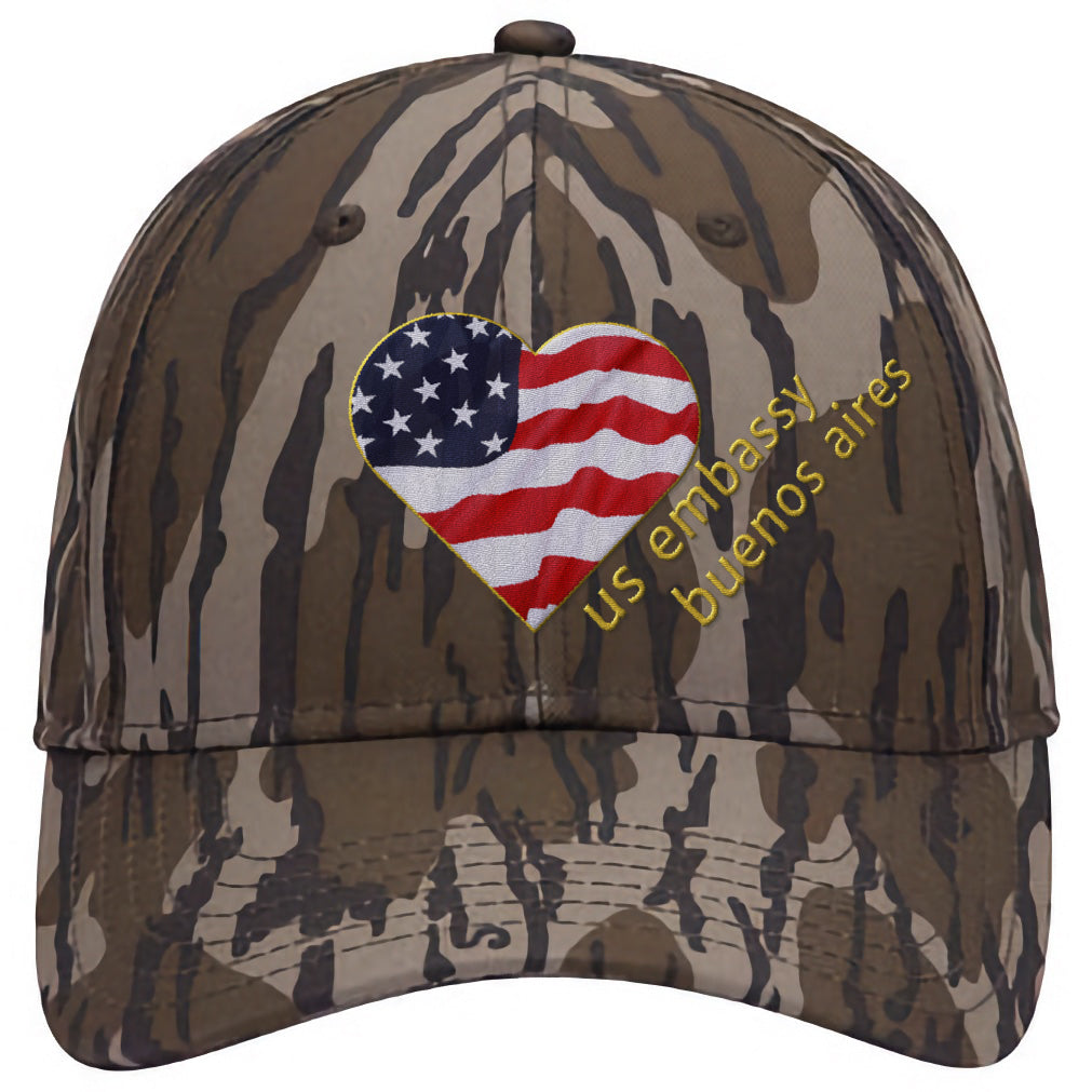 Top quality, structured, camouflaged 6 Panel hat is offered in six printed designs. These printed designs are Mossy Oak® favorites which help you keep your head out of sight in a variety of environments. The only thing that won't melt into the background is the striking and fun ♥ logo featuring a centered US Flag heart and an off-center post name. Wear this proudly anywhere you want to be seen and not seen at the same time!