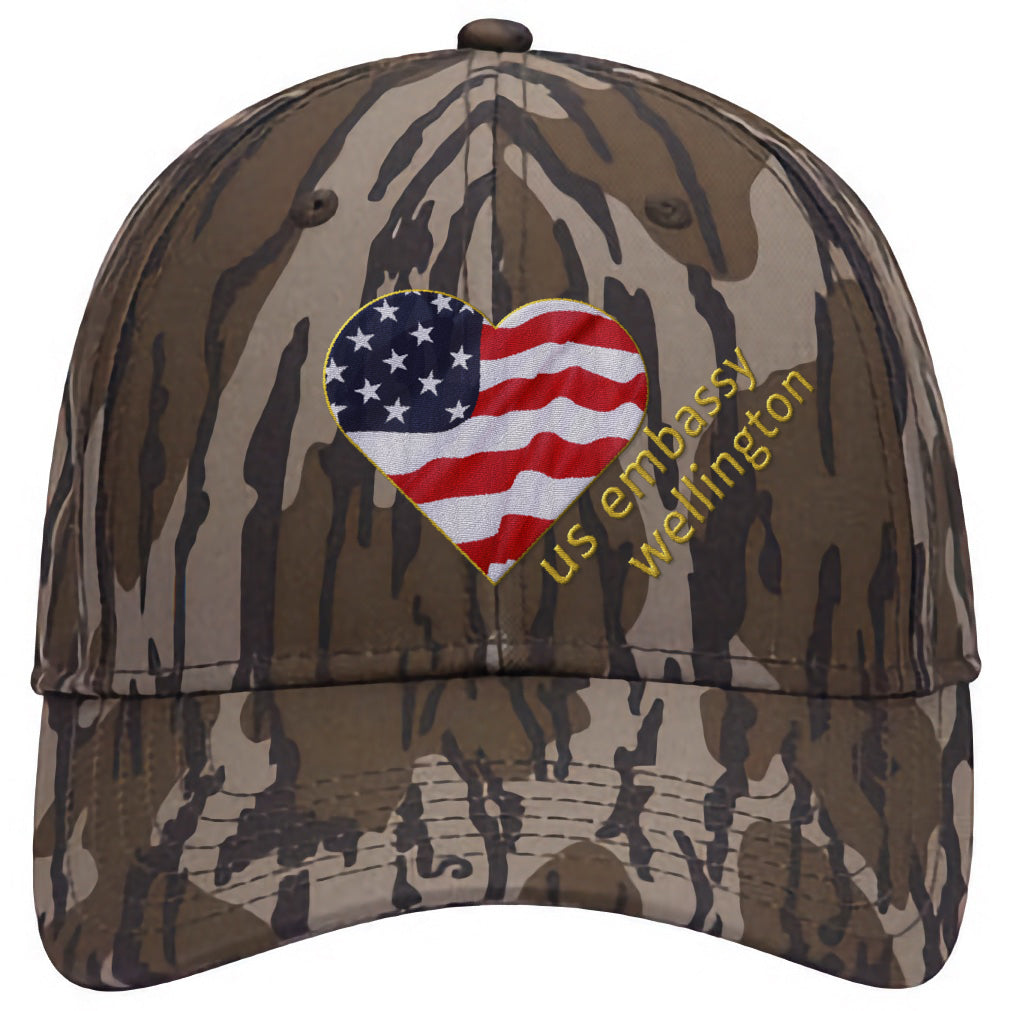 Top quality, structured, camouflaged 6 Panel hat is offered in six printed designs. These printed designs are Mossy Oak® favorites which help you keep your head out of sight in a variety of environments. The only thing that won't melt into the background is the striking and fun ♥ logo featuring a centered US Flag heart and an off-center post name. Wear this proudly anywhere you want to be seen and not seen at the same time!