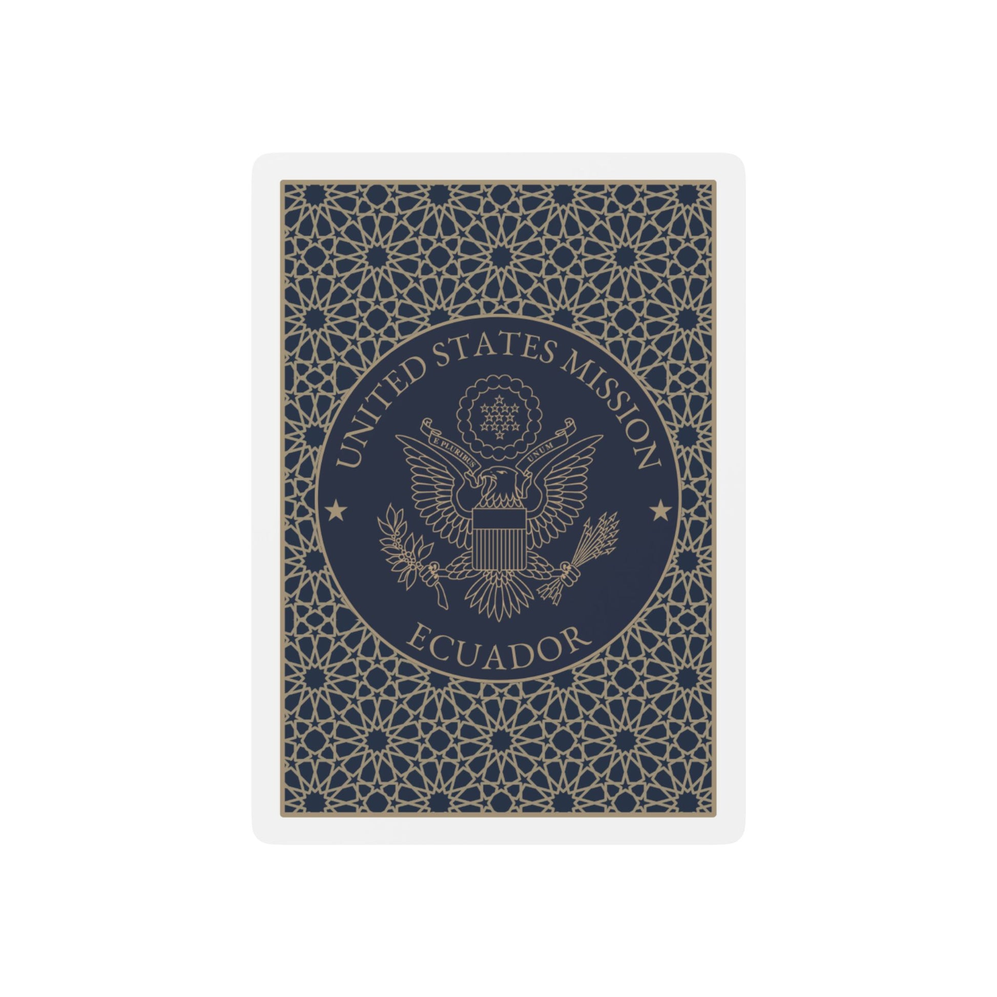 Looking for the perfect gift to bring a touch of home to your family and friends? Maybe a reminder of where you are actually posted now and not three tours ago? Introducing our exclusive Poker Playing Cards, featuring a classic midnight blue and gold U.S. Embassy design on a smooth 300gsm premium-coated cardstock! This standard 52-card deck, complete with 2 jokers, is printed with vibrant colors and crafted for perfect dealing and shuffling—ideal for those long overseas evenings spent listening to the hum of a generator. These 06 FAM 0527-ready cards are authorized as long as you don't the the thing.
