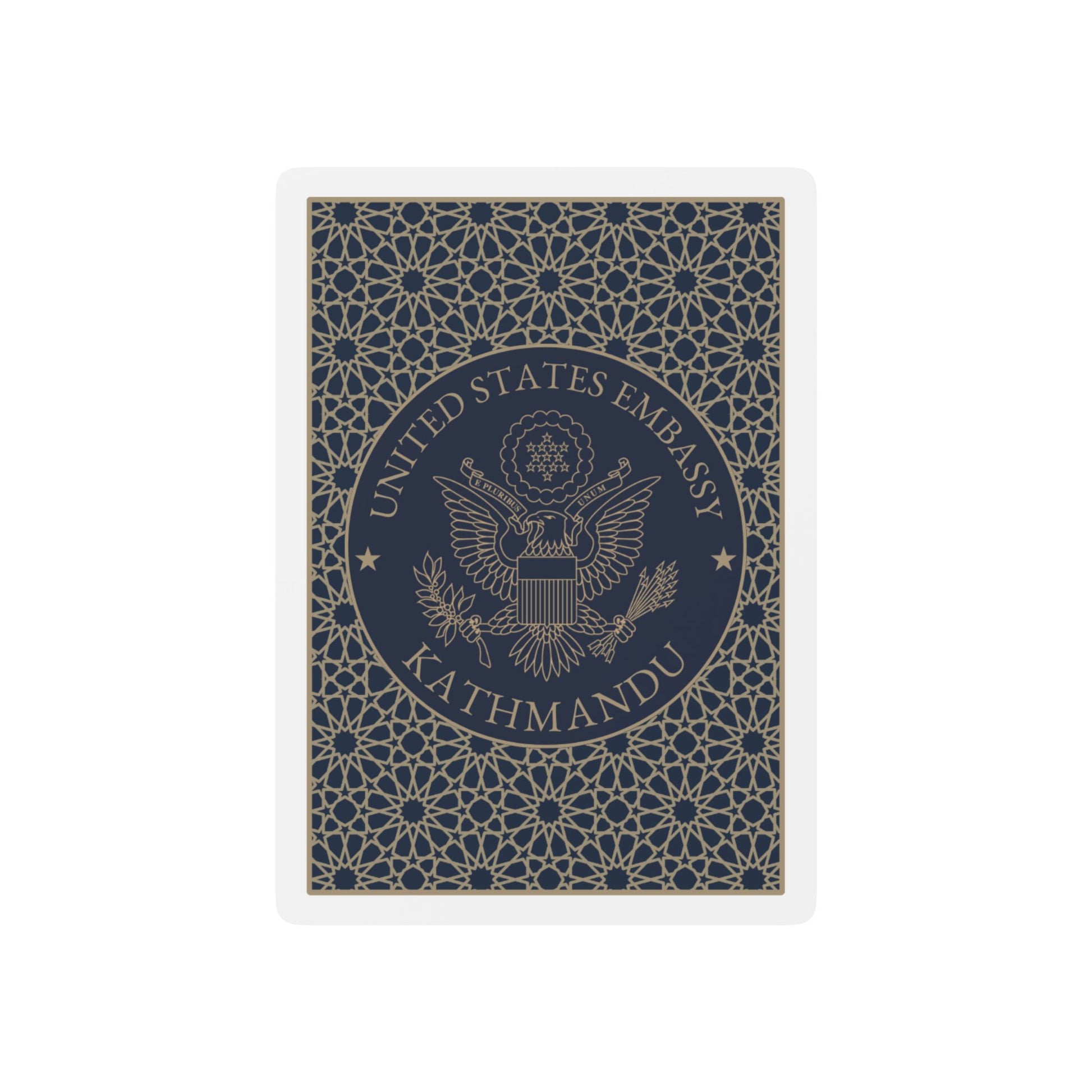 Looking for the perfect gift to bring a touch of home to your family and friends? Maybe a reminder of where you are actually posted now and not three tours ago? Introducing our exclusive Poker Playing Cards, featuring a classic midnight blue and gold U.S. Embassy design on a smooth 300gsm premium-coated cardstock! This standard 52-card deck, complete with 2 jokers, is printed with vibrant colors and crafted for perfect dealing and shuffling—ideal for those long overseas evenings spent listening to the hum of a generator. These 06 FAM 0527-ready cards are authorized as long as you don't the the thing.