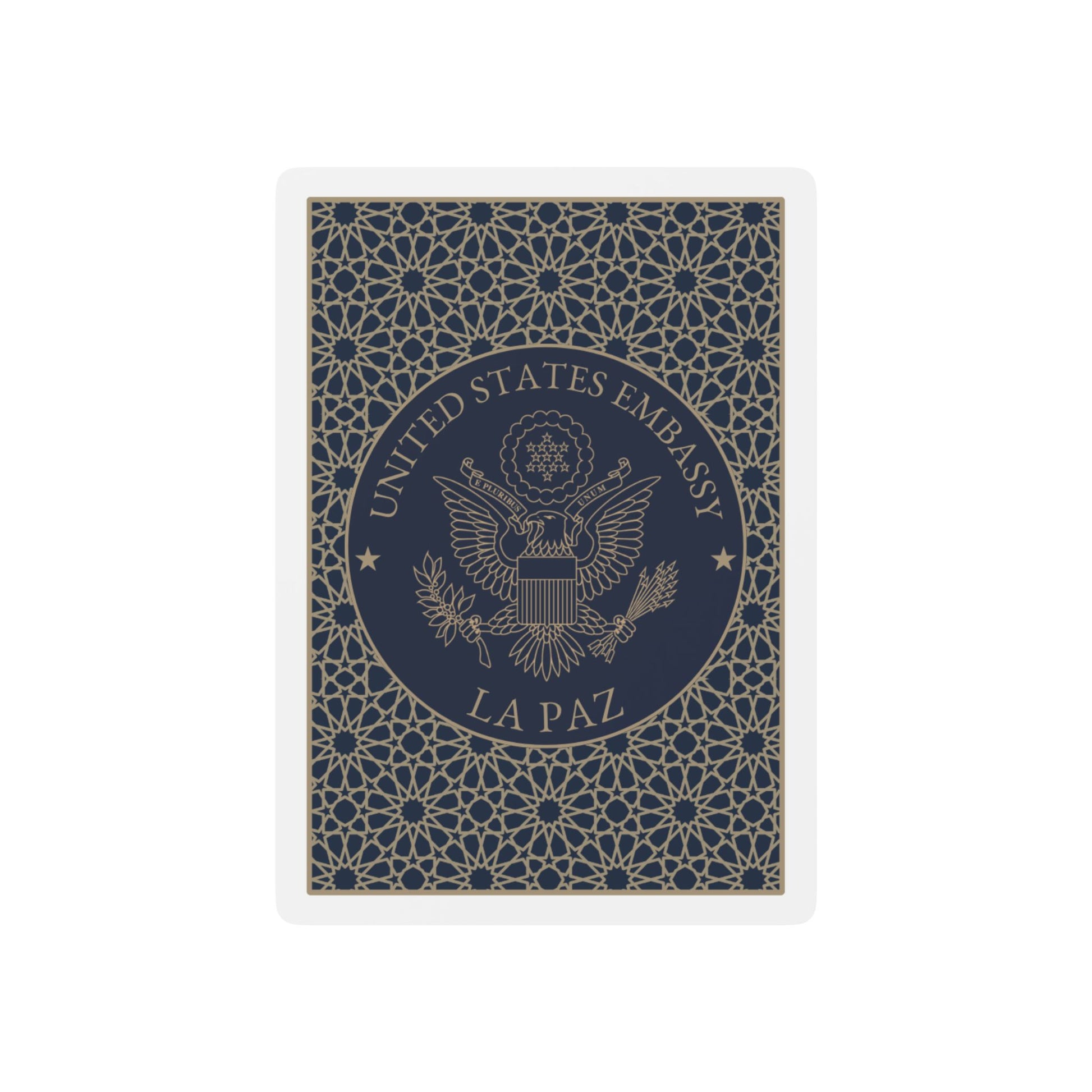 Looking for the perfect gift to bring a touch of home to your family and friends? Maybe a reminder of where you are actually posted now and not three tours ago? Introducing our exclusive Poker Playing Cards, featuring a classic midnight blue and gold U.S. Embassy design on a smooth 300gsm premium-coated cardstock! This standard 52-card deck, complete with 2 jokers, is printed with vibrant colors and crafted for perfect dealing and shuffling—ideal for those long overseas evenings spent listening to the hum of a generator. These 06 FAM 0527-ready cards are authorized as long as you don't the the thing.