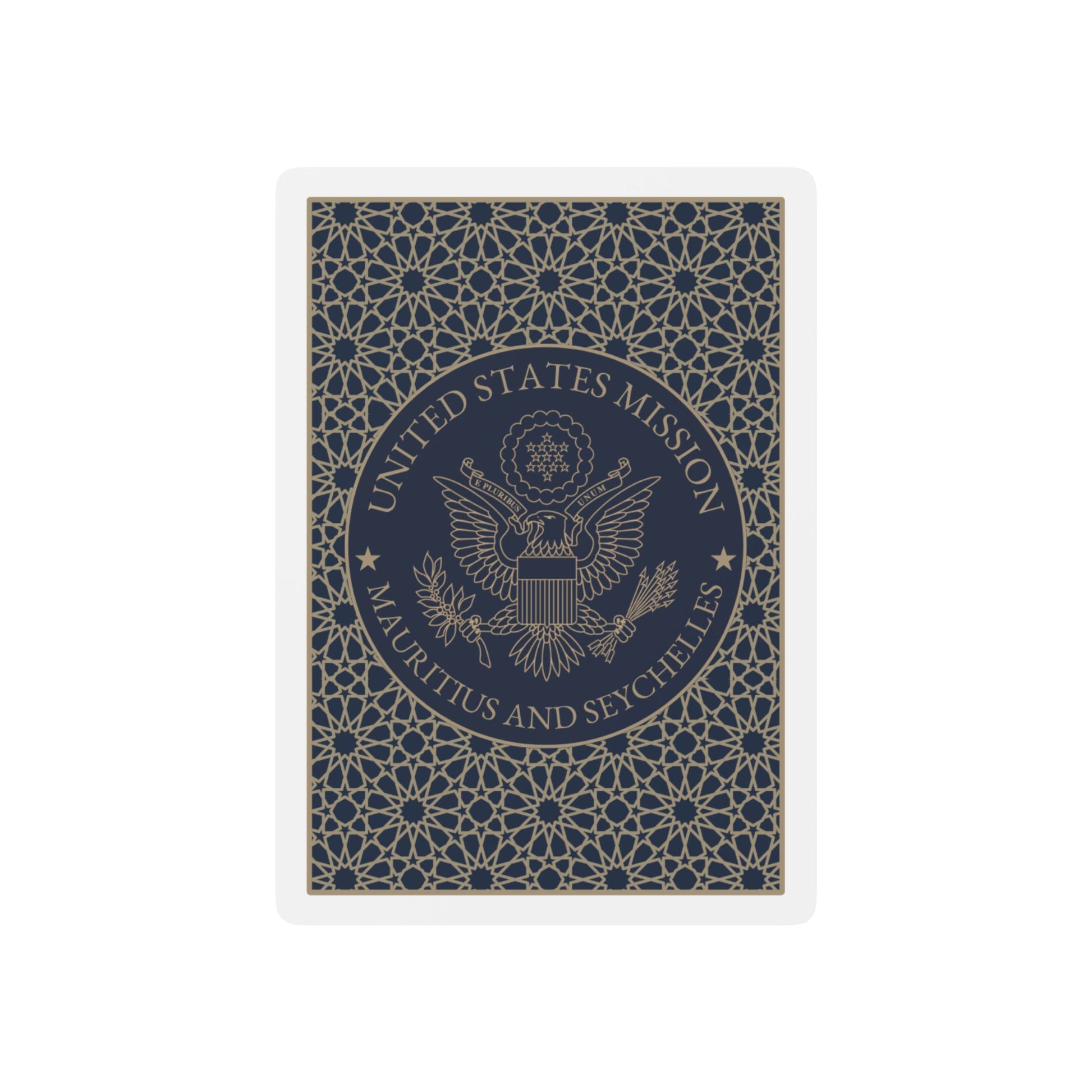 Looking for the perfect gift to bring a touch of home to your family and friends? Maybe a reminder of where you are actually posted now and not three tours ago? Introducing our exclusive Poker Playing Cards, featuring a classic midnight blue and gold U.S. Embassy design on a smooth 300gsm premium-coated cardstock! This standard 52-card deck, complete with 2 jokers, is printed with vibrant colors and crafted for perfect dealing and shuffling—ideal for those long overseas evenings spent listening to the hum of a generator. These 06 FAM 0527-ready cards are authorized as long as you don't the the thing.