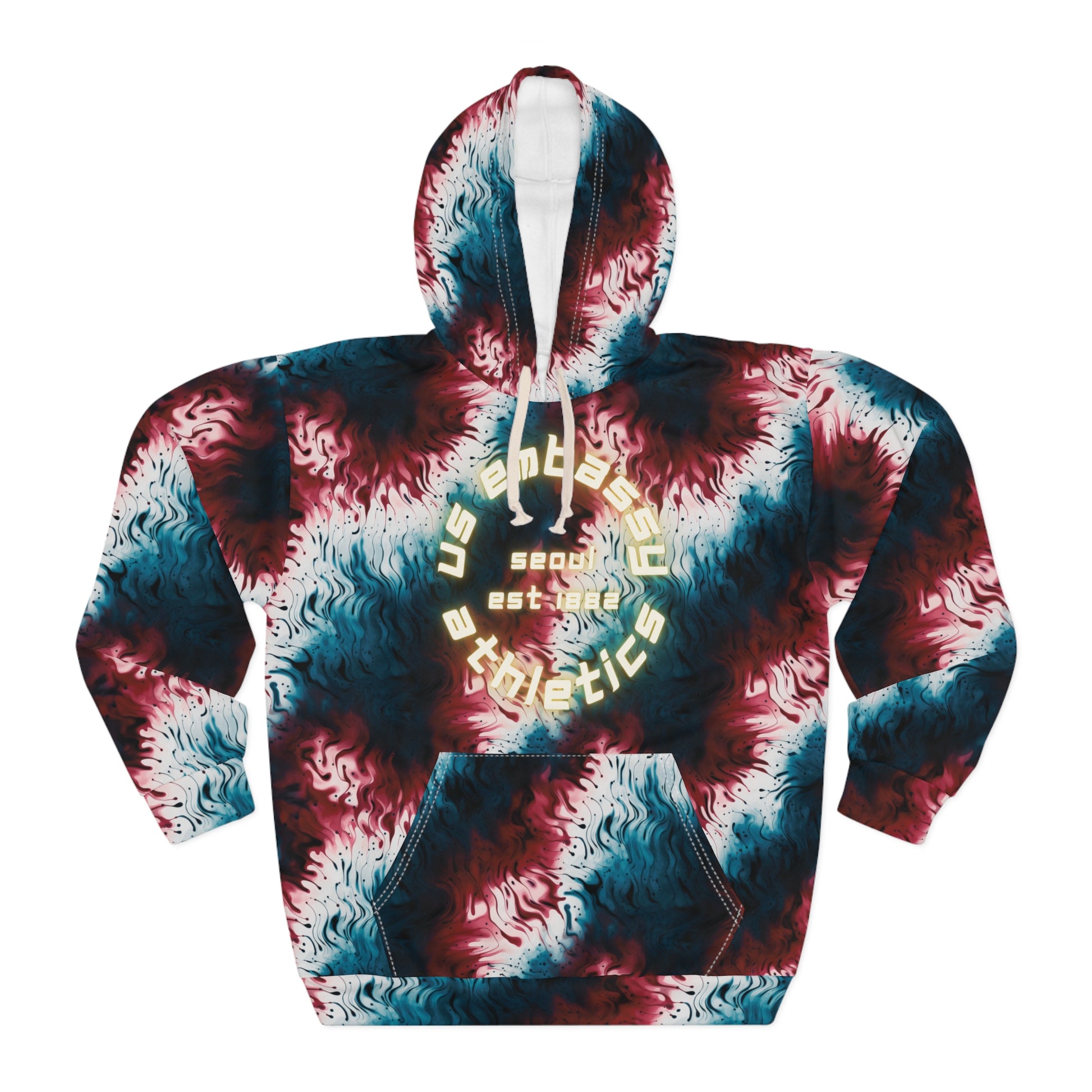 This Pullover Hoodie features an all-over print tie-die design in deep reds and blues. Wear your post athletic gear proudly. Each hoodie harkens back to when diplomatic relations with the host nation were established - or re-established - or re-re-established. The eye-catching design instantly becomes fashionable. It features a large front pocket, a hood with a drawstring, and is custom cut and sewn.
