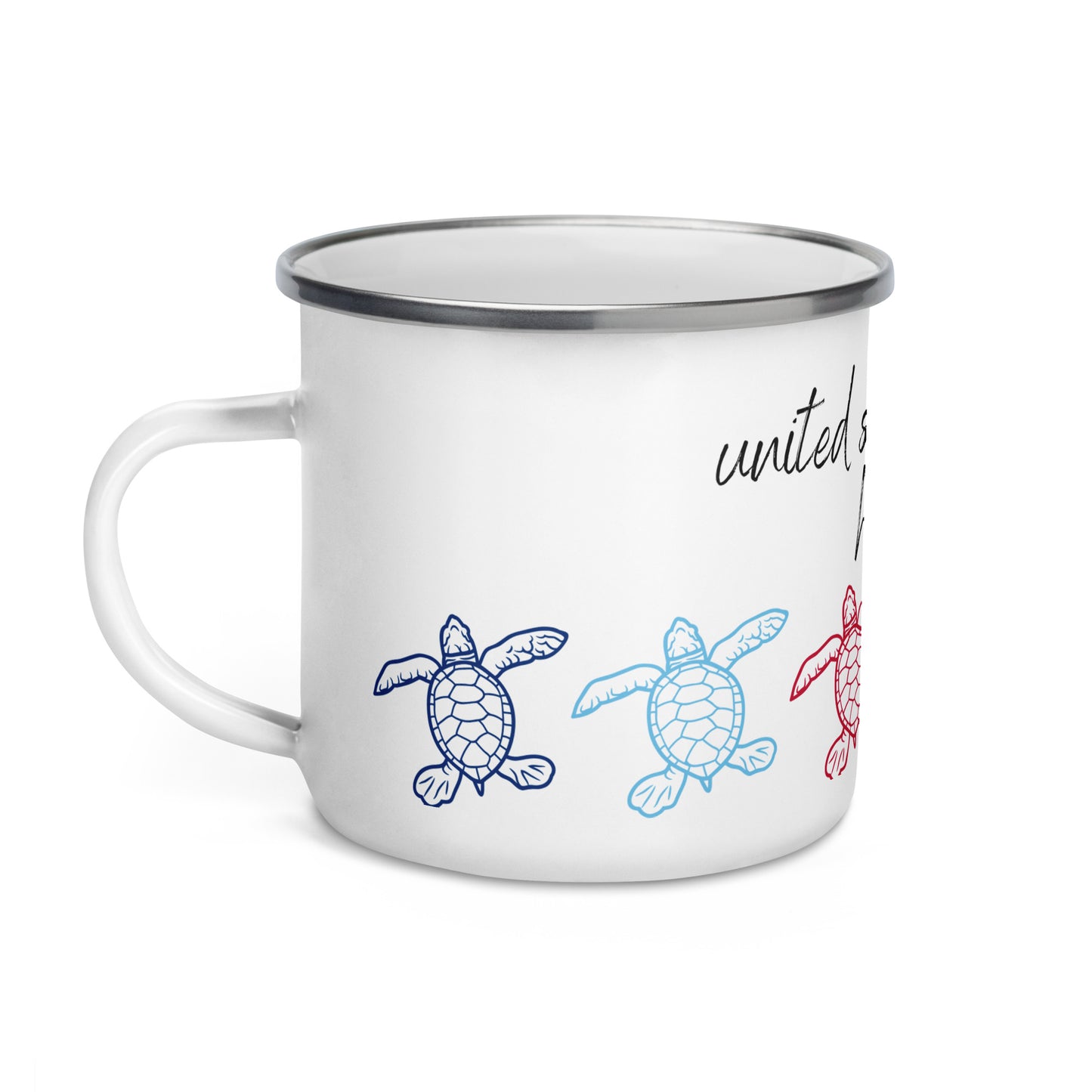 Get your hands on this stainless steel durable mug coated in a hardy enamel. This modern take on a nostalgic favorite holds 12 ounces of your favorite beverage. The mug features a design that someone without a passport thought might remind you of your post.