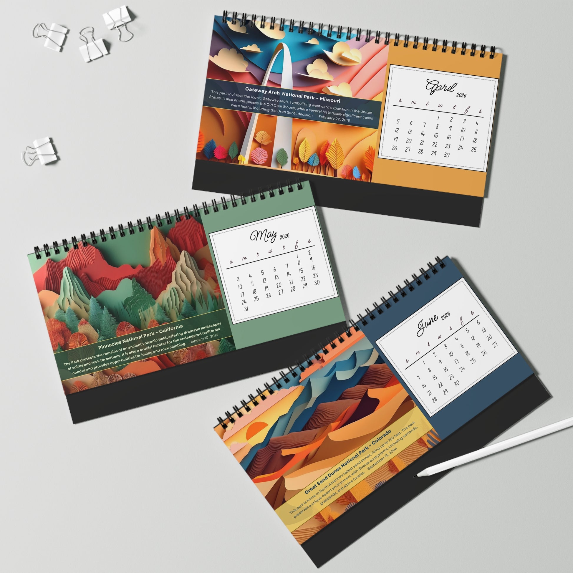 Embark on a year-long adventure through America's most recent natural wonders with "America's Newest National Parks 2026 Calendar." This spiral-bound desktop calendar showcases the 12 latest additions to the U.S. national park system, each month bringing to life a vibrant, layered paper-cut illustration that captures the unique terrain and spirit of these protected landscapes—from the soaring sand dunes of White Sands in New Mexico to the rugged river canyons of New River Gorge in West Virginia, and the ancient forests of Congaree in South Carolina.
