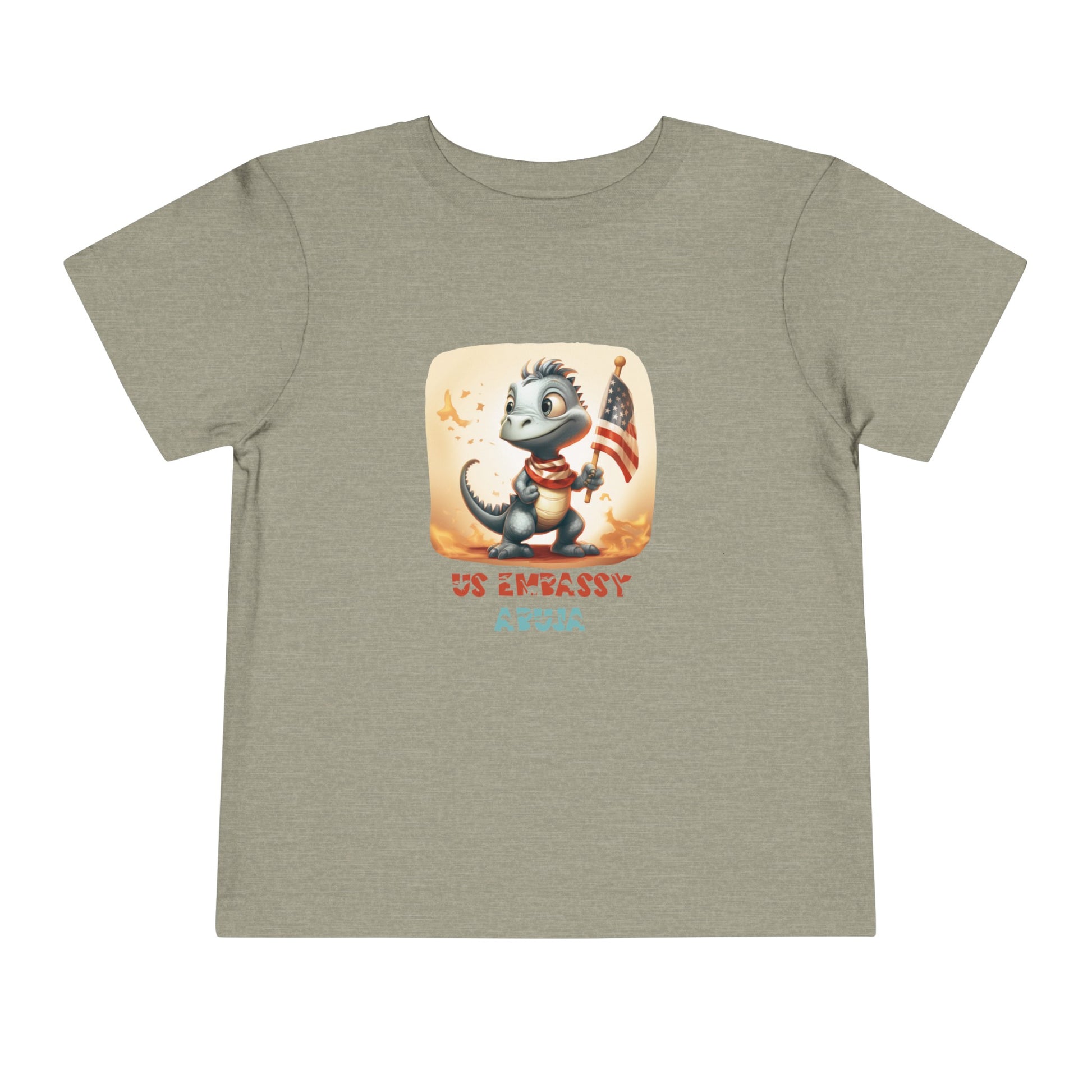 Uplift any child's wardrobe with a custom dinosaur kid's t-shirt. The Bella Canvas short sleeve tee for toddlers is a 100% Airlume combed and ring-spun cotton jersey with a tear-away label for extra comfort. Choose your favorite color out of a big variety, and make unique staples that toddlers will happily wear every day. Each t-shirt features a patriotic pre-historic dinosaur and post's name in a unique, jurassic-inspired font. 100% Airlume combed and ringspun cotton (fiber content may vary for different colors) Extra light fabric (3.9 oz/yd² (132 g/m²)) Tear-away label 2T 3T 4T 5T Width, in 12.00 13.00 14.00 15.00 Length, in 15.50 16.50 17.50 18.51