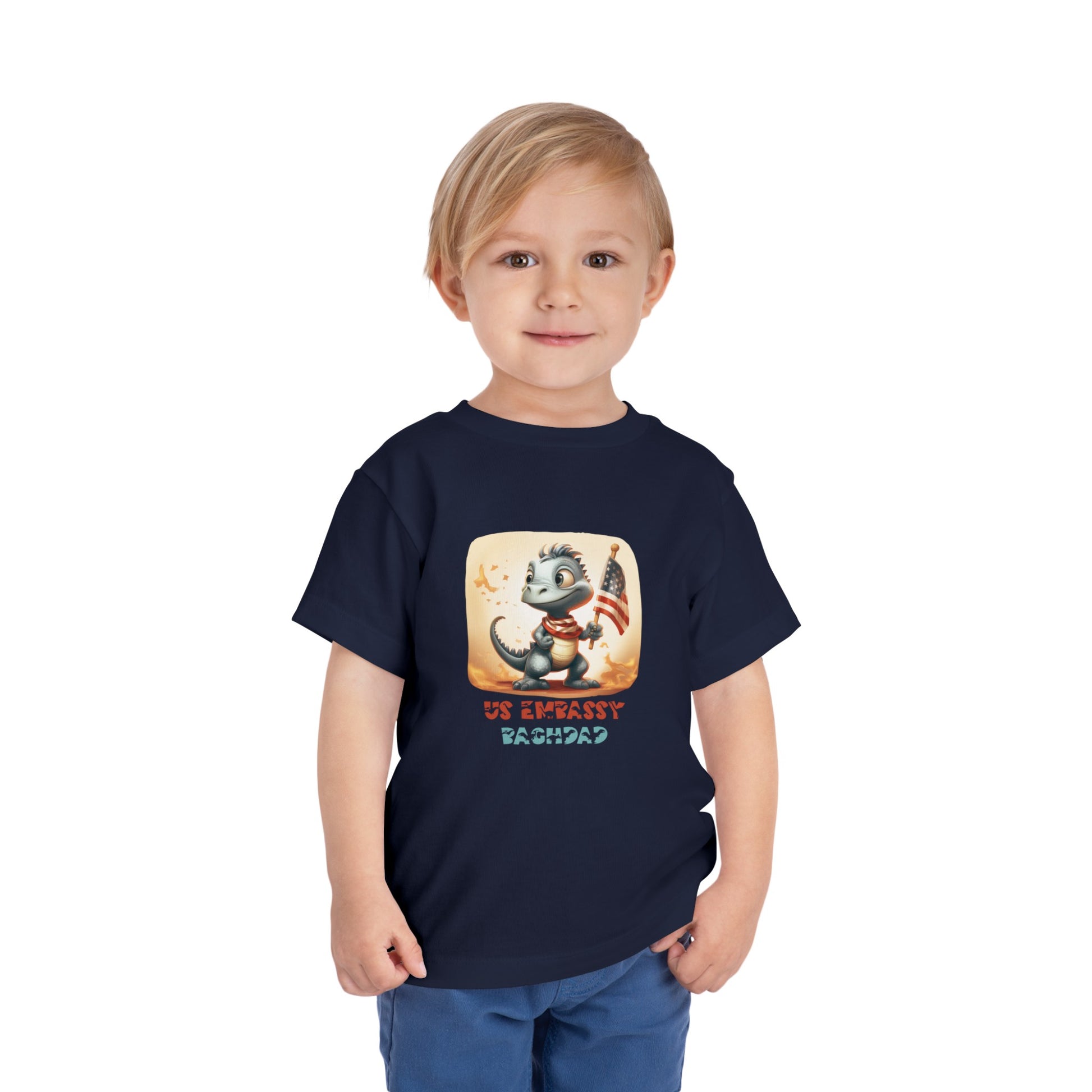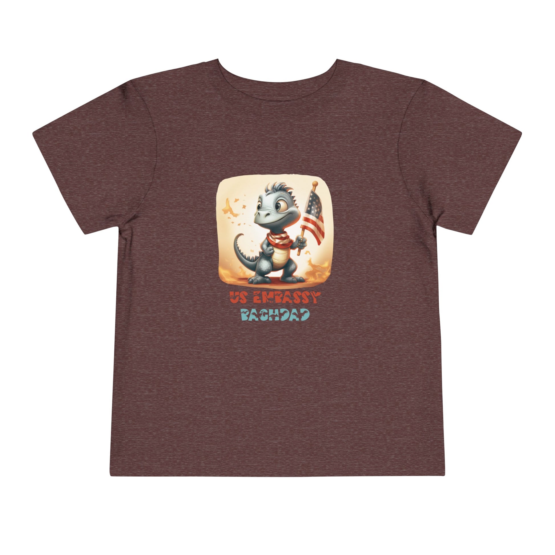 Uplift any child's wardrobe with a custom dinosaur kid's t-shirt. The Bella Canvas short sleeve tee for toddlers is a 100% Airlume combed and ring-spun cotton jersey with a tear-away label for extra comfort. Choose your favorite color out of a big variety, and make unique staples that toddlers will happily wear every day. Each t-shirt features a patriotic pre-historic dinosaur and post's name in a unique, jurassic-inspired font. 100% Airlume combed and ringspun cotton (fiber content may vary for different colors) Extra light fabric (3.9 oz/yd² (132 g/m²)) Tear-away label 2T 3T 4T 5T Width, in 12.00 13.00 14.00 15.00 Length, in 15.50 16.50 17.50 18.169