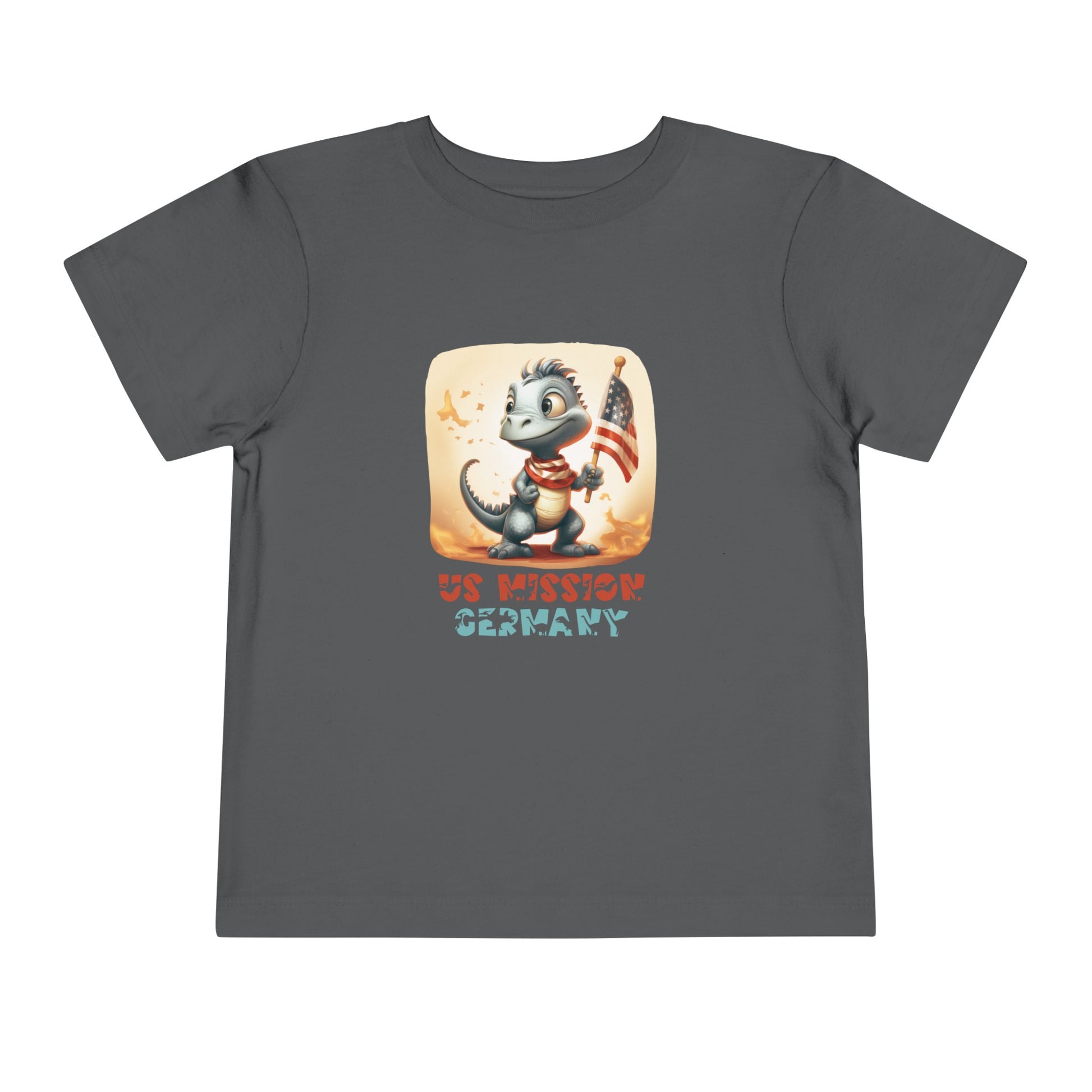 Uplift any child's wardrobe with a custom dinosaur kid's t-shirt. The Bella Canvas short sleeve tee for toddlers is a 100% Airlume combed and ring-spun cotton jersey with a tear-away label for extra comfort. Choose your favorite color out of a big variety, and make unique staples that toddlers will happily wear every day. Each t-shirt features a patriotic pre-historic dinosaur and post's name in a unique, jurassic-inspired font. 100% Airlume combed and ringspun cotton (fiber content may vary for different colors) Extra light fabric (3.9 oz/yd² (132 g/m²)) Tear-away label 2T 3T 4T 5T Width, in 12.00 13.00 14.00 15.00 Length, in 15.50 16.50 17.50 18.315