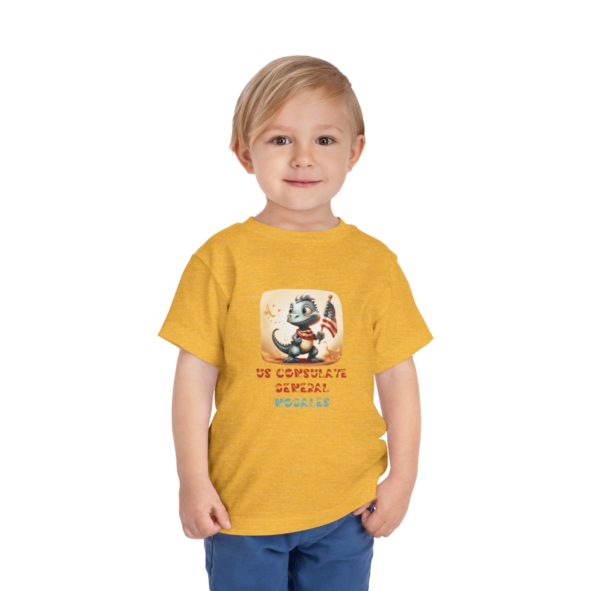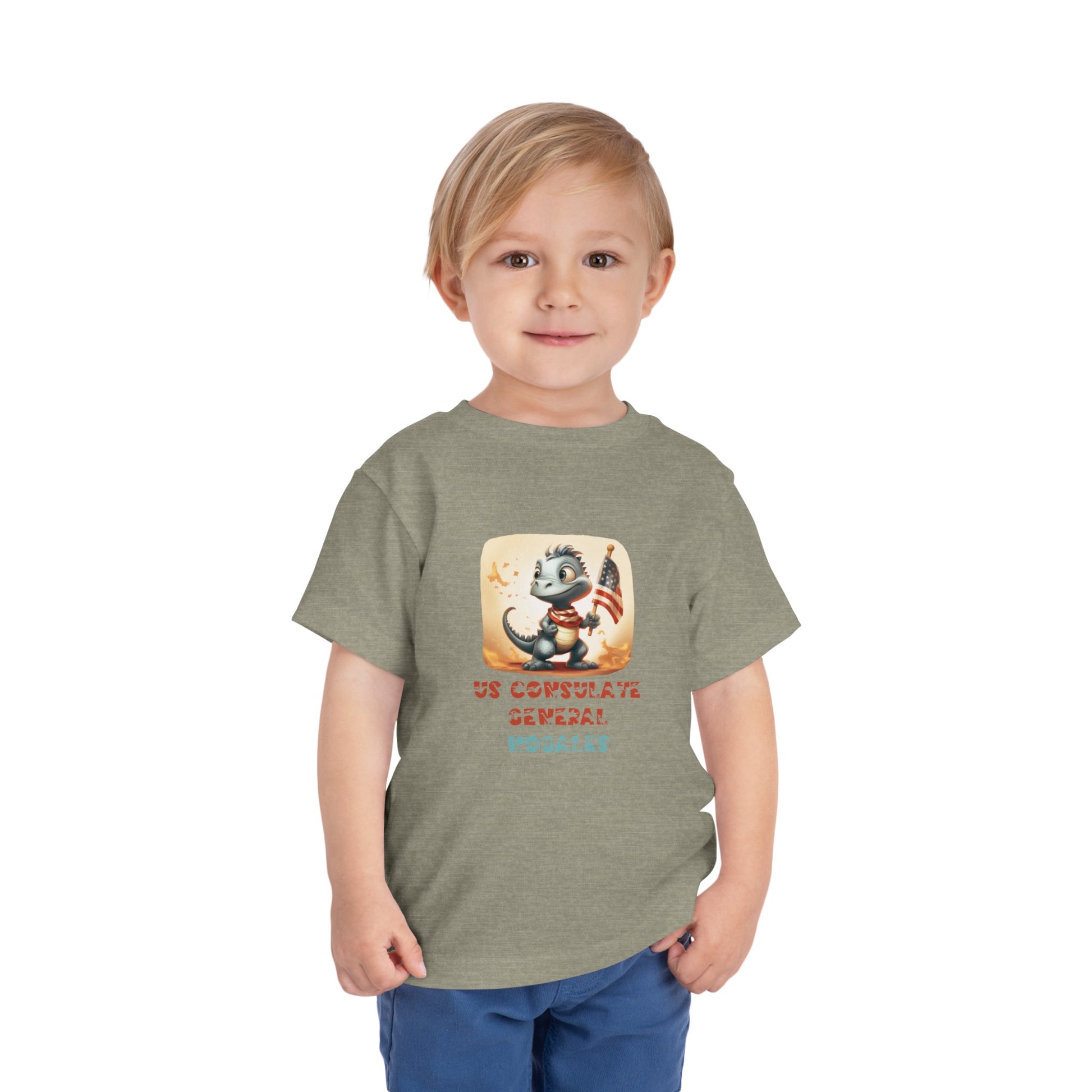 Uplift any child's wardrobe with a custom dinosaur kid's t-shirt. The Bella Canvas short sleeve tee for toddlers is a 100% Airlume combed and ring-spun cotton jersey with a tear-away label for extra comfort. Choose your favorite color out of a big variety, and make unique staples that toddlers will happily wear every day. Each t-shirt features a patriotic pre-historic dinosaur and post's name in a unique, jurassic-inspired font. 100% Airlume combed and ringspun cotton (fiber content may vary for different colors) Extra light fabric (3.9 oz/yd² (132 g/m²)) Tear-away label 2T 3T 4T 5T Width, in 12.00 13.00 14.00 15.00 Length, in 15.50 16.50 17.50 18.282