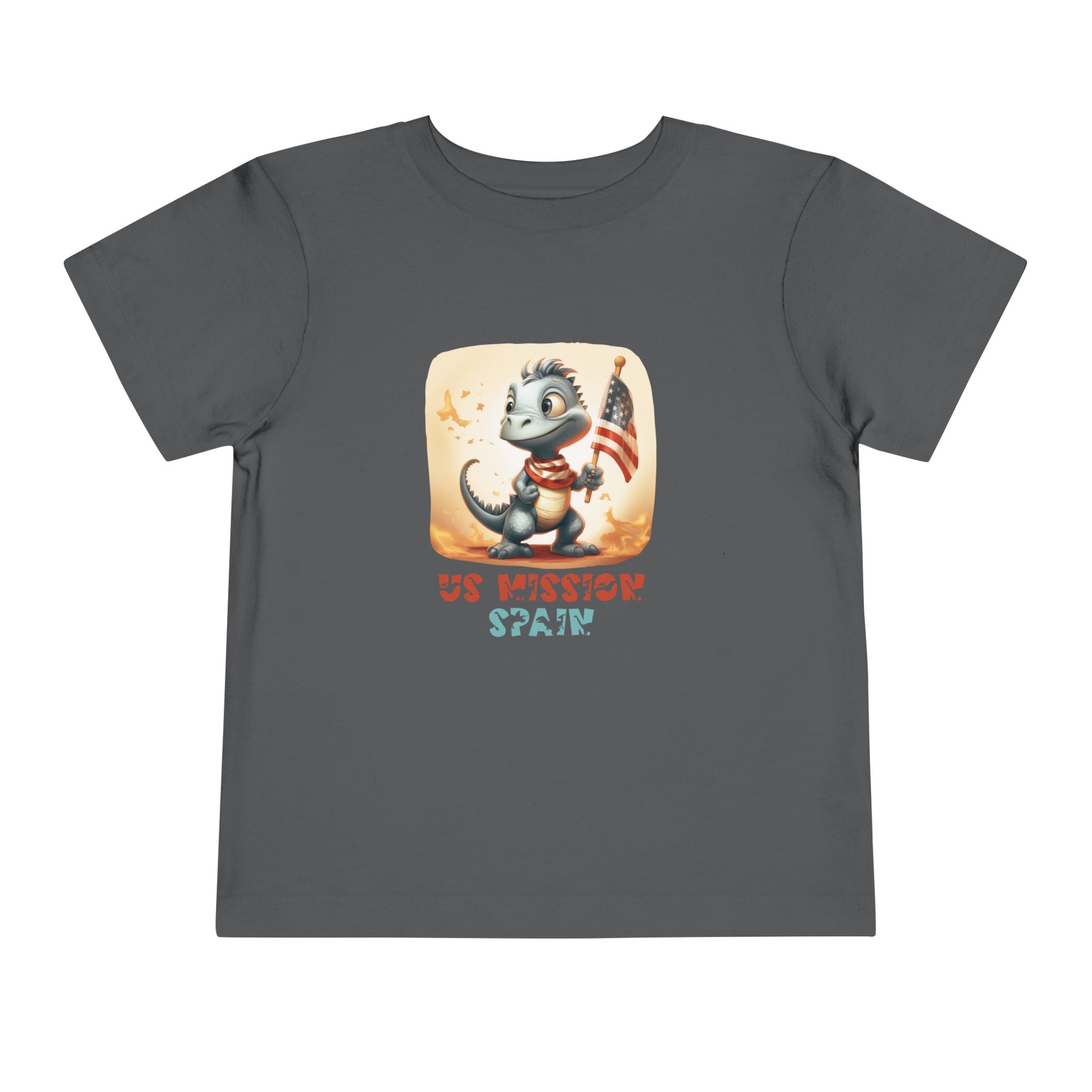 Uplift any child's wardrobe with a custom dinosaur kid's t-shirt. The Bella Canvas short sleeve tee for toddlers is a 100% Airlume combed and ring-spun cotton jersey with a tear-away label for extra comfort. Choose your favorite color out of a big variety, and make unique staples that toddlers will happily wear every day. Each t-shirt features a patriotic pre-historic dinosaur and post's name in a unique, jurassic-inspired font. 100% Airlume combed and ringspun cotton (fiber content may vary for different colors) Extra light fabric (3.9 oz/yd² (132 g/m²)) Tear-away label 2T 3T 4T 5T Width, in 12.00 13.00 14.00 15.00 Length, in 15.50 16.50 17.50 18.327