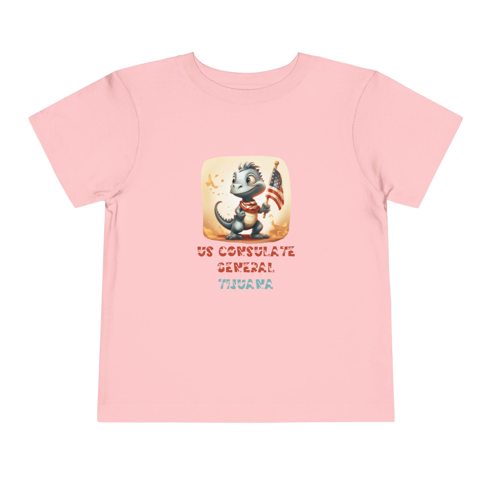 Uplift any child's wardrobe with a custom dinosaur kid's t-shirt. The Bella Canvas short sleeve tee for toddlers is a 100% Airlume combed and ring-spun cotton jersey with a tear-away label for extra comfort. Choose your favorite color out of a big variety, and make unique staples that toddlers will happily wear every day. Each t-shirt features a patriotic pre-historic dinosaur and post's name in a unique, jurassic-inspired font. 100% Airlume combed and ringspun cotton (fiber content may vary for different colors) Extra light fabric (3.9 oz/yd² (132 g/m²)) Tear-away label 2T 3T 4T 5T Width, in 12.00 13.00 14.00 15.00 Length, in 15.50 16.50 17.50 18.288