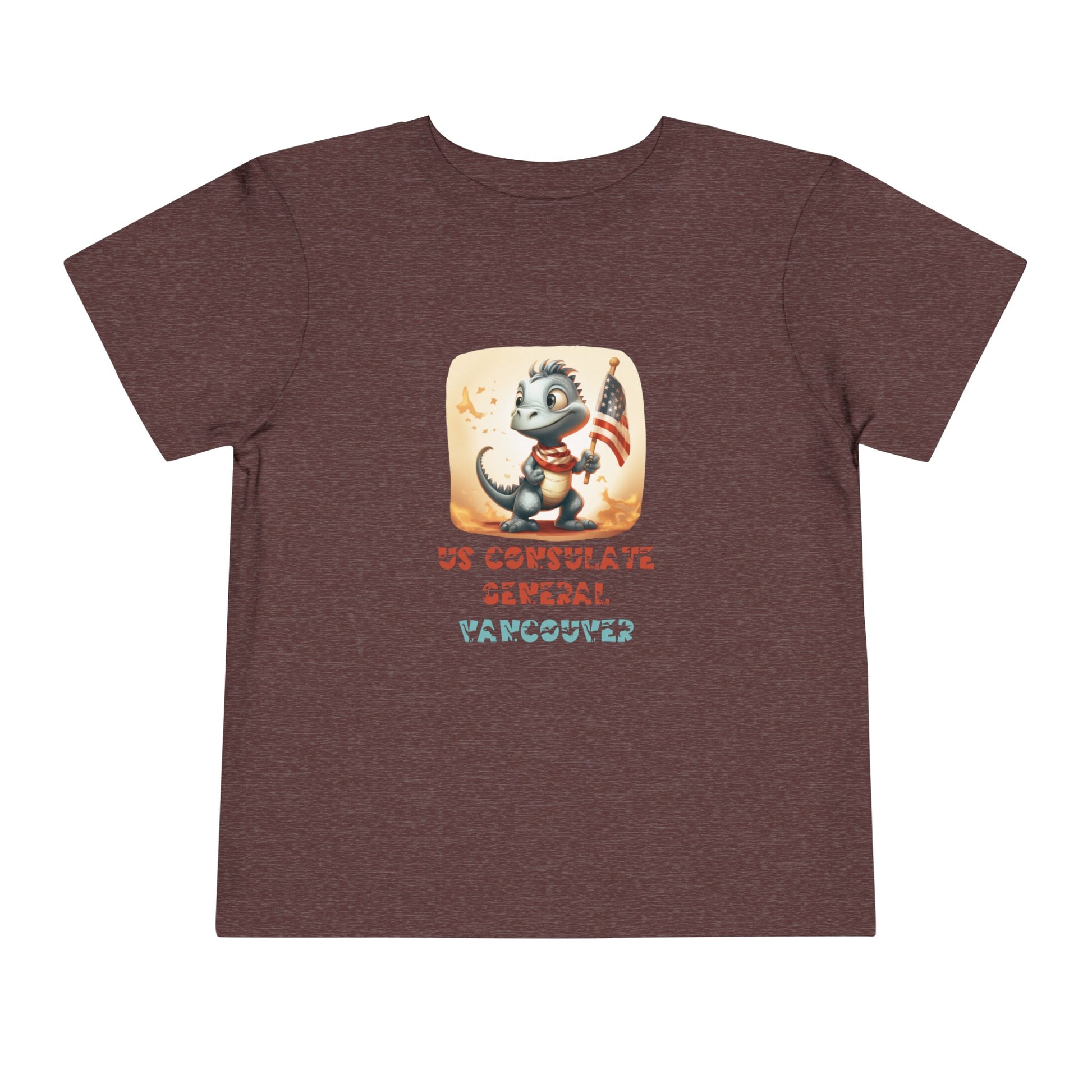 Uplift any child's wardrobe with a custom dinosaur kid's t-shirt. The Bella Canvas short sleeve tee for toddlers is a 100% Airlume combed and ring-spun cotton jersey with a tear-away label for extra comfort. Choose your favorite color out of a big variety, and make unique staples that toddlers will happily wear every day. Each t-shirt features a patriotic pre-historic dinosaur and post's name in a unique, jurassic-inspired font. 100% Airlume combed and ringspun cotton (fiber content may vary for different colors) Extra light fabric (3.9 oz/yd² (132 g/m²)) Tear-away label 2T 3T 4T 5T Width, in 12.00 13.00 14.00 15.00 Length, in 15.50 16.50 17.50 18.290