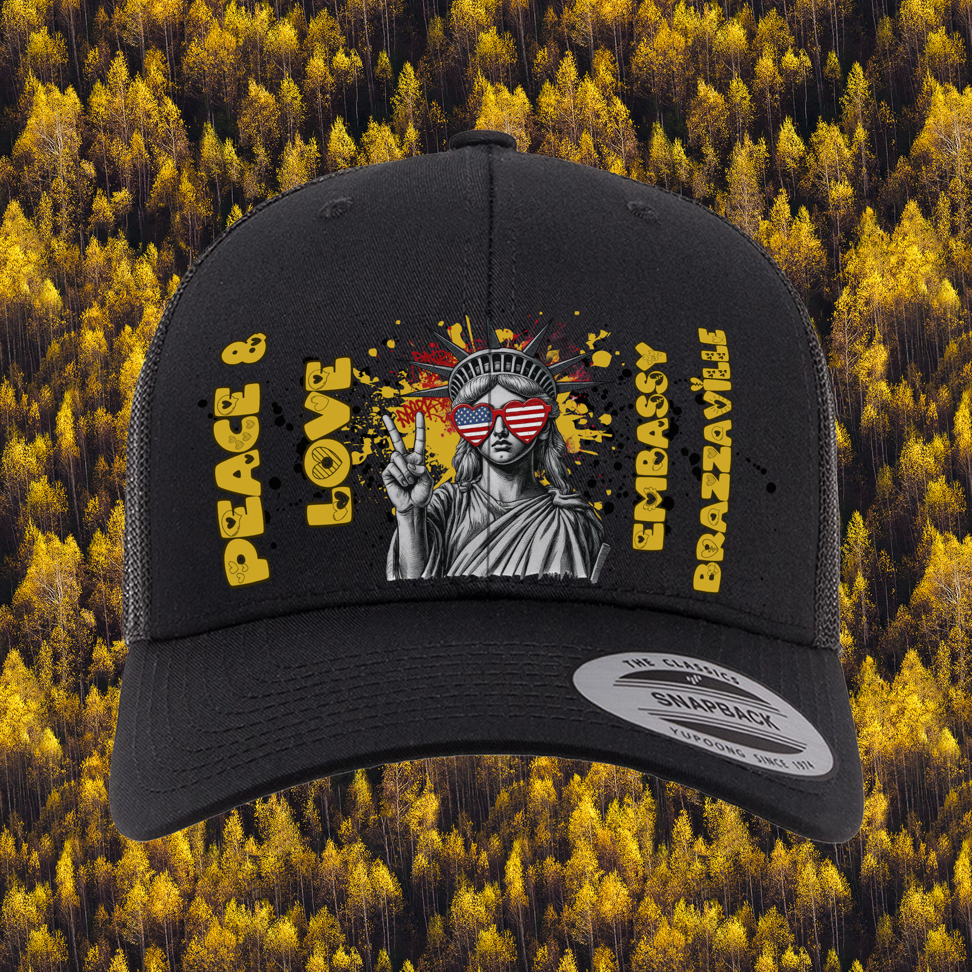 Looking to rep some post vibes with a dash of American spirit? We've got just the thing: our exclusive "Peace & Love" trucker hats! Picture the iconic Statue of Liberty rocking star-spangled shades, flashing a peace sign, and surrounded by graffiti-style splashes—it's fun, funky, and totally you.