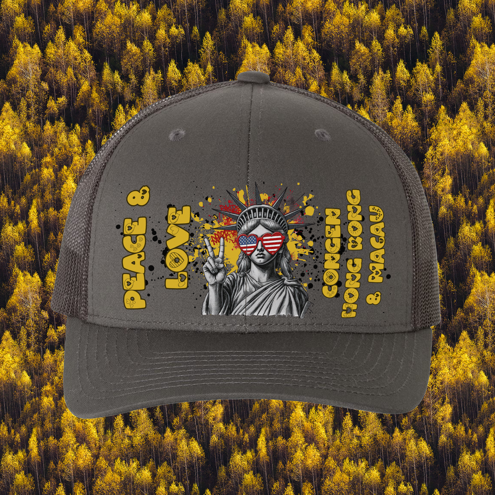 Looking to rep some post vibes with a dash of American spirit? We've got just the thing: our exclusive "Peace & Love" trucker hats! Picture the iconic Statue of Liberty rocking star-spangled shades, flashing a peace sign, and surrounded by graffiti-style splashes—it's fun, funky, and totally you.