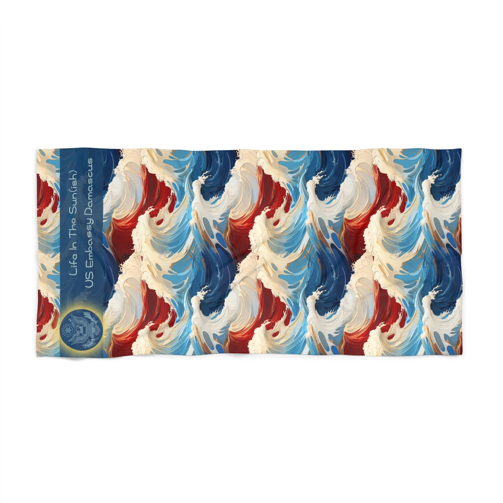 Beach days are always a bliss – and pool days are not far behind! Showing up with this massive 30" X 60" luxuriously soft and customized beach towel will add a bit more sunshine to your day. This heavyweight towel feels extra lush to the touch as it features polyester facing on the printed side. The Hokusai inspired design comes through in vivid detail. The towel also features a cotton loop backing for durability. Please note, humble brag, due to the thickness of the towel the print colors may not soak all the way through the fabric and white background can show through when towel fibers are stroked. 50% Polyester 50% Cotton White cotton loop backing One-sided print