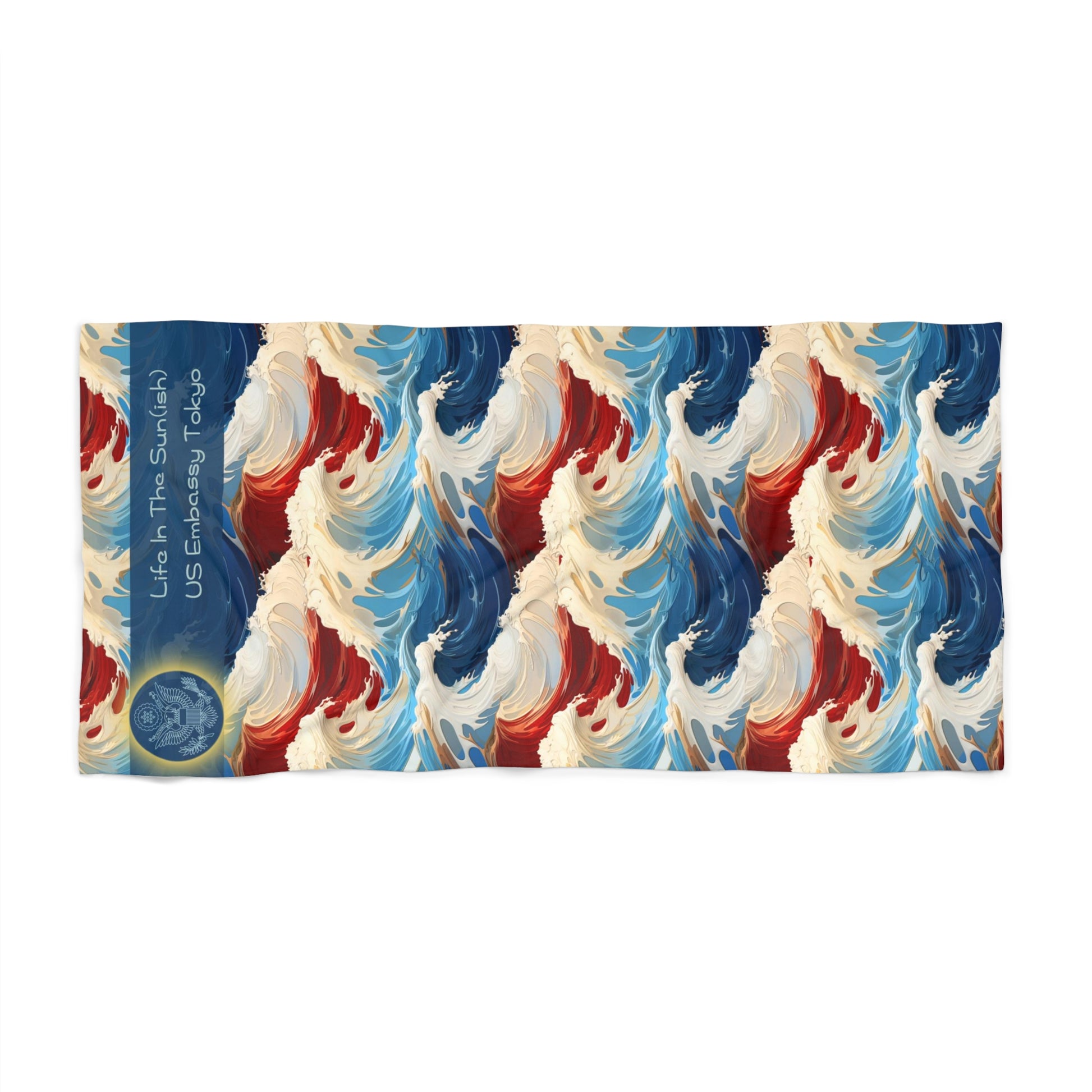 Beach days are always a bliss – and pool days are not far behind! Showing up with this massive 30" X 60" luxuriously soft and customized beach towel will add a bit more sunshine to your day. This heavyweight towel feels extra lush to the touch as it features polyester facing on the printed side. The Hokusai inspired design comes through in vivid detail. The towel also features a cotton loop backing for durability. Please note, humble brag, due to the thickness of the towel the print colors may not soak all the way through the fabric and white background can show through when towel fibers are stroked. 50% Polyester 50% Cotton White cotton loop backing One-sided print
