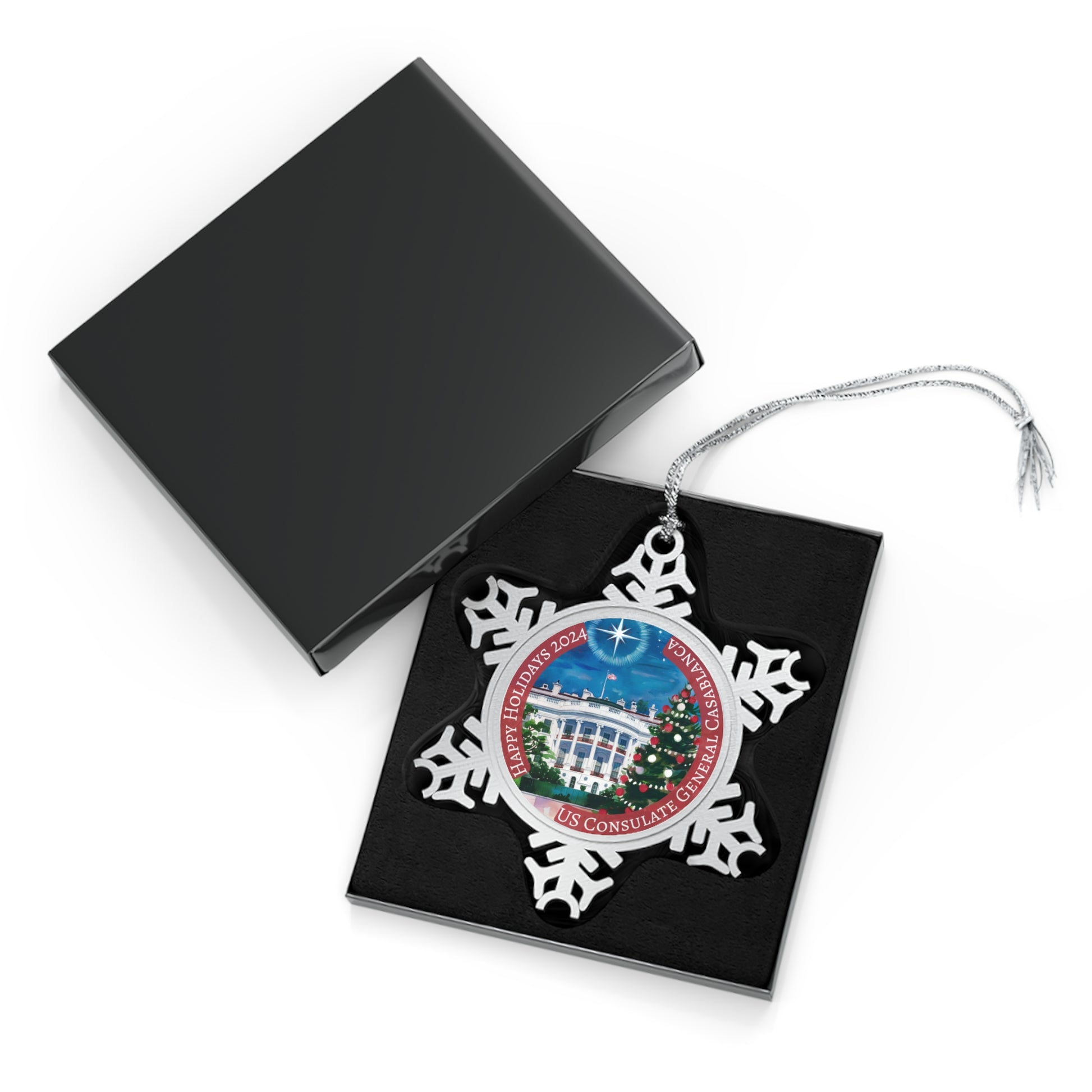 Our pewter snowflakes are made in a high-quality pewter construction and unique snowflake styling. The 2024 ornament features a beautiful watermark drawing of the White House with a Christmas tree in the foreground. Each ornament comes in its own box, with silver-toned hanging string. These are perfect for holiday decor, award displays, and other celebratory occasions.