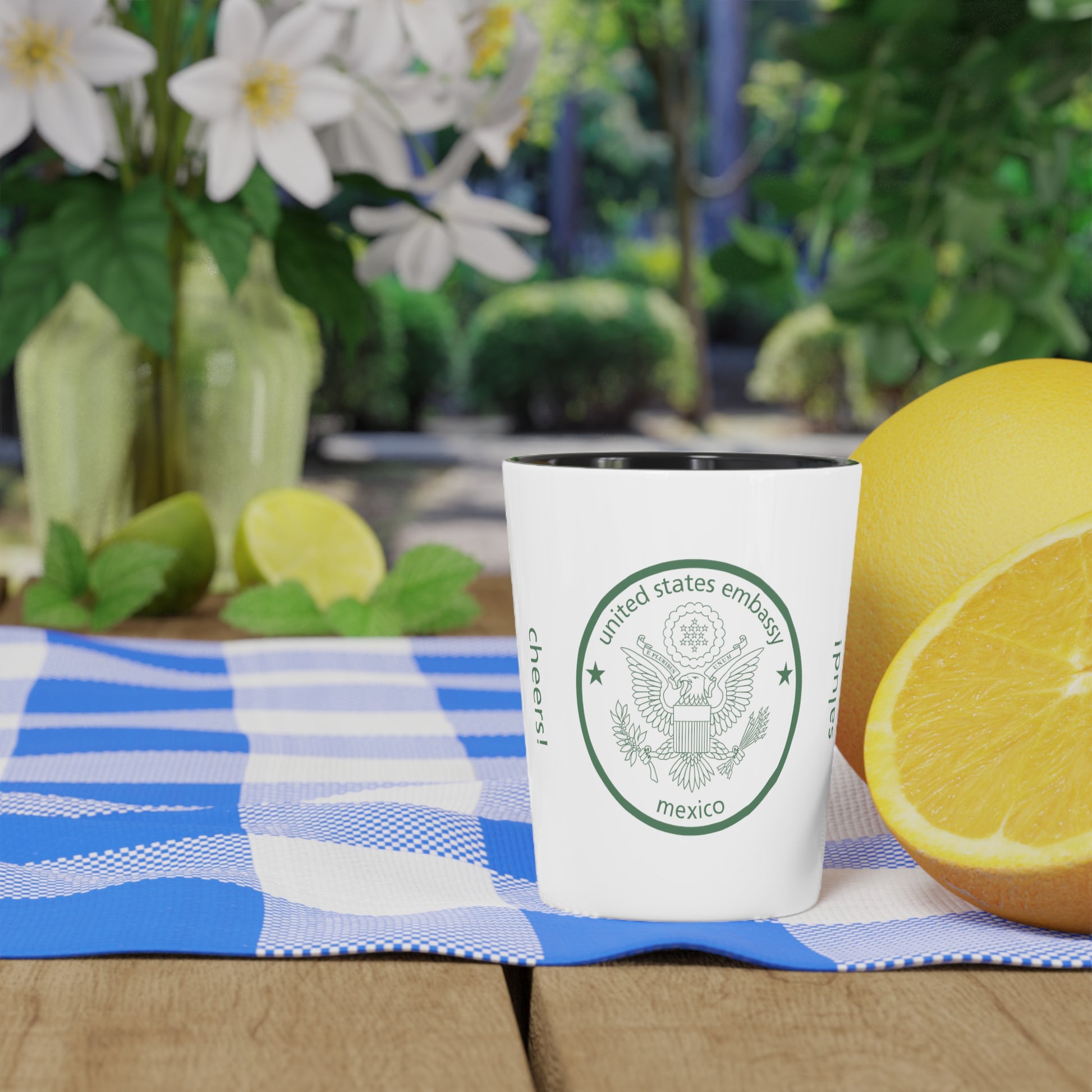 Made with ceramic material, this custom shot glass comes with a black interior. These are made only when you place your order and are produced in any quanity you like. They are great as a unique gift idea as well.