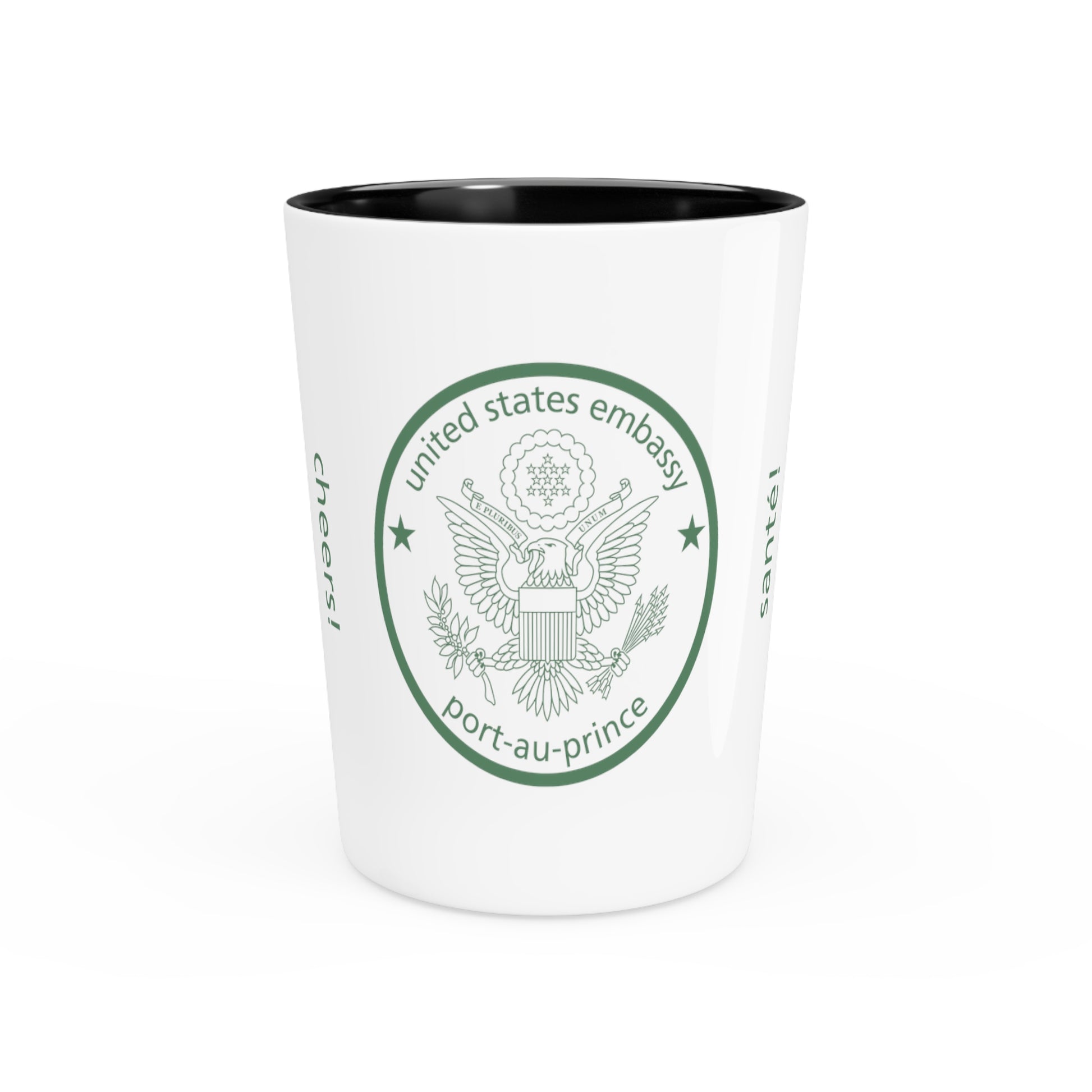 Made with ceramic material, this custom shot glass comes with a black interior. These are made only when you place your order and are produced in any quanity you like. They are great as a unique gift idea as well.