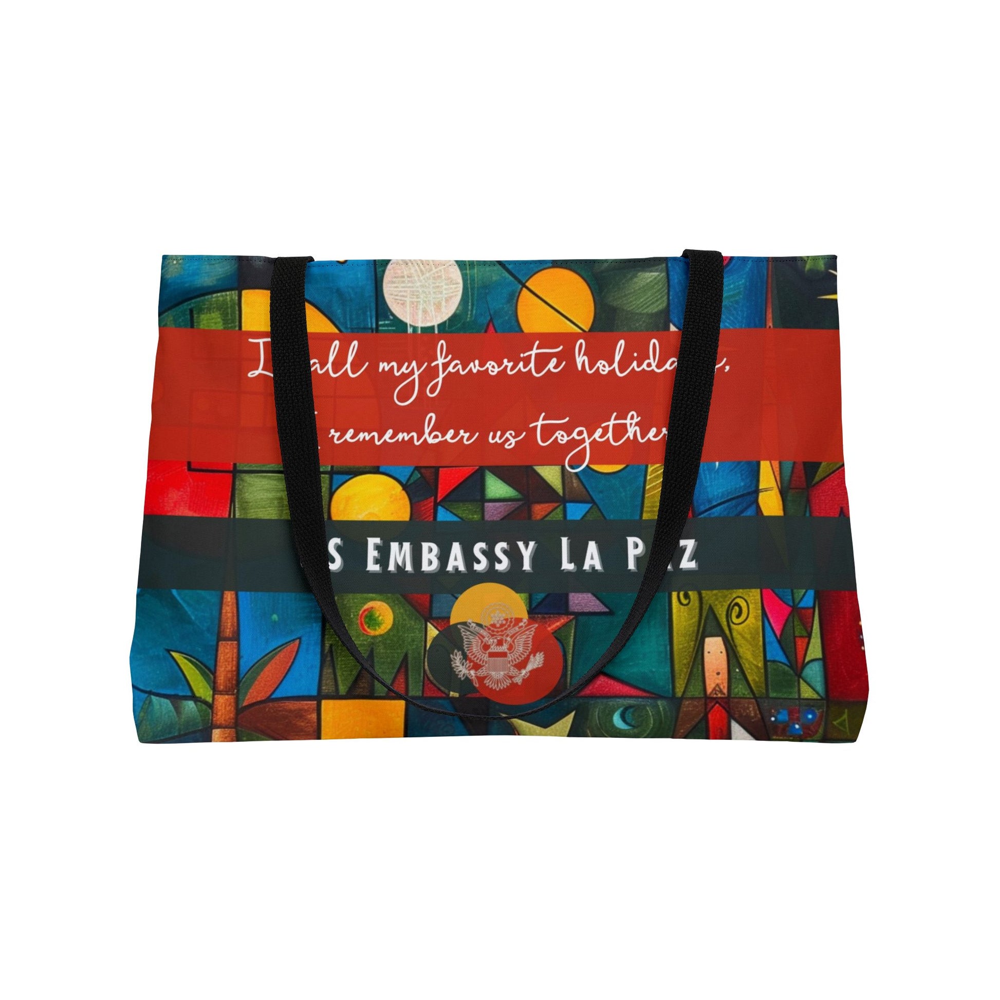 Thinking about the holidays, we got Klee in the brain. We can't say why, but there you go. This colorful take on a night in Bethlehem forms the backdrop to a touching message about what really matters during the holidays - being together with people you love. Whether you are carrying gifts, potluck dishes to the Embassy Christmas party, or a few beach supplies for that southern hemisphere summer Christmas, this bag can fit it all. Or buy a few and give them away as gifts to friends and family, encouraging them to ditch the plastic and seize the colorful one-of-a-kind design.