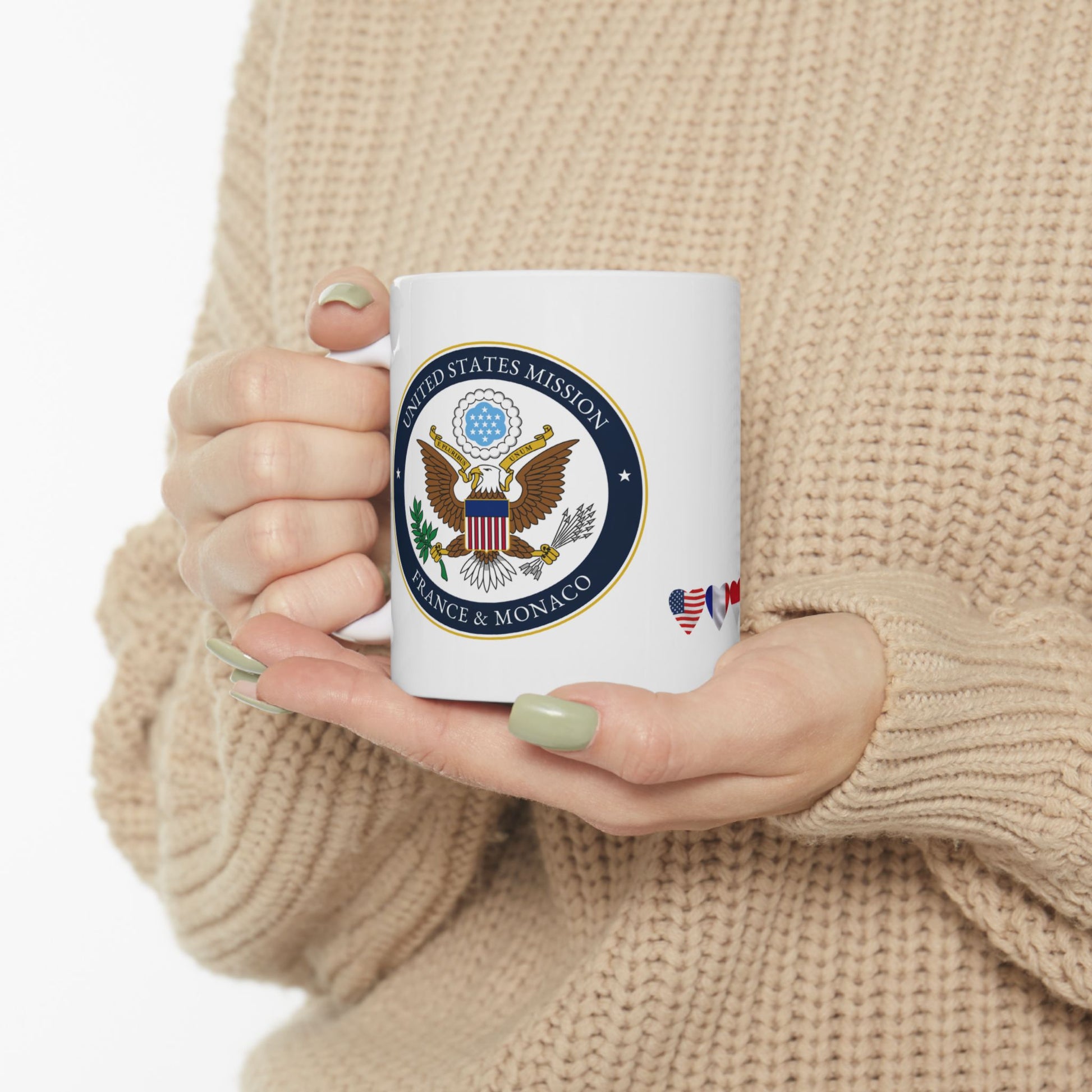 We call this the Ron Swanson. It is every type of classic. No fancy interpretation of the Great Seal, no mumbo jumbo. Just a very useful, sturdy coffee mug with a well crafted post seal on the front. White ceramic 11 oz (0.33 l) Rounded corners C-handle Lead and BPA-free. 11oz Height, in 3.74 Diameter, in 3.15