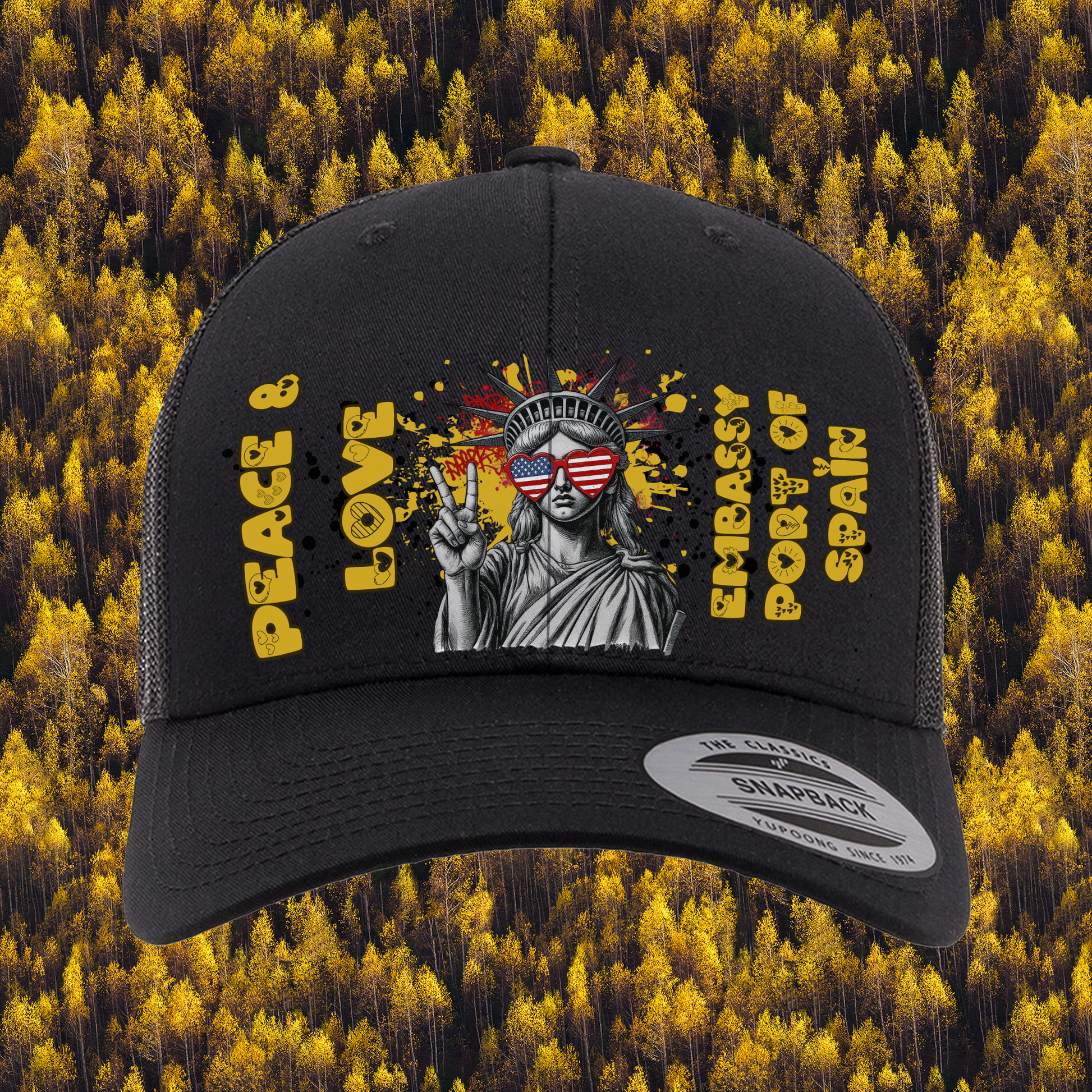 Looking to rep some post vibes with a dash of American spirit? We've got just the thing: our exclusive "Peace & Love" trucker hats! Picture the iconic Statue of Liberty rocking star-spangled shades, flashing a peace sign, and surrounded by graffiti-style splashes—it's fun, funky, and totally you.