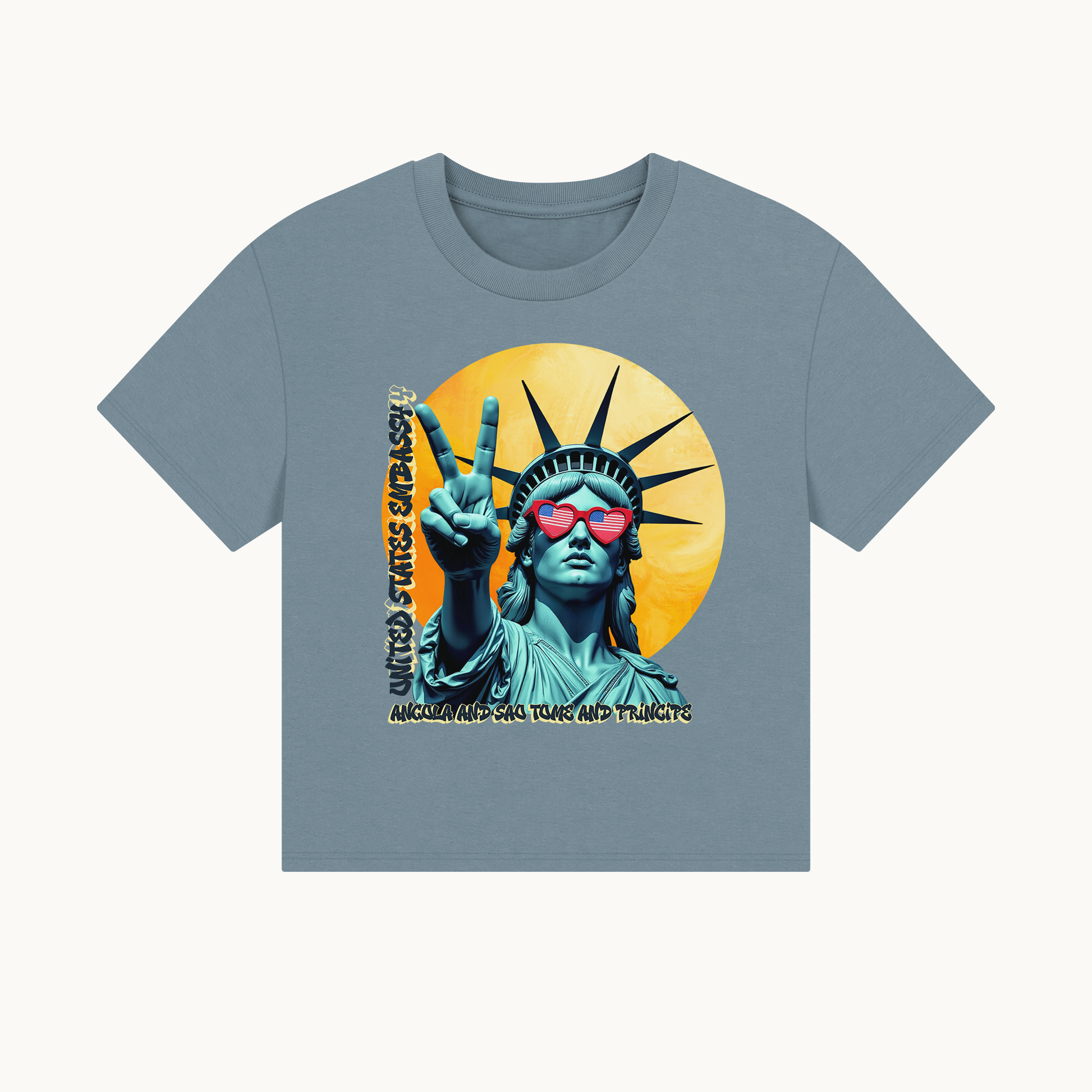 Featuring a fabulously campy twist on Lady Liberty—rocking heart-shaped shades and a peace sign—paired with all that post flair, this tee screams global glam! Available in XS-5XL and rocking colors like White, Black, Stone Blue, and wild Tie Dye, it’s the perfect blend of comfort and quirky style.Crafted from 100% Organic Cotton with a cropped, oversized fit, this lightweight (4.57 oz/yd²) gem offers all-day coziness with a classic crew neck and ribbed collar. Perfect for embassy shindigs, beach outings, or lounging like a diplomatic diva! Eco-friendly and trendy, it’s a must-have for sustainable fashionistas.